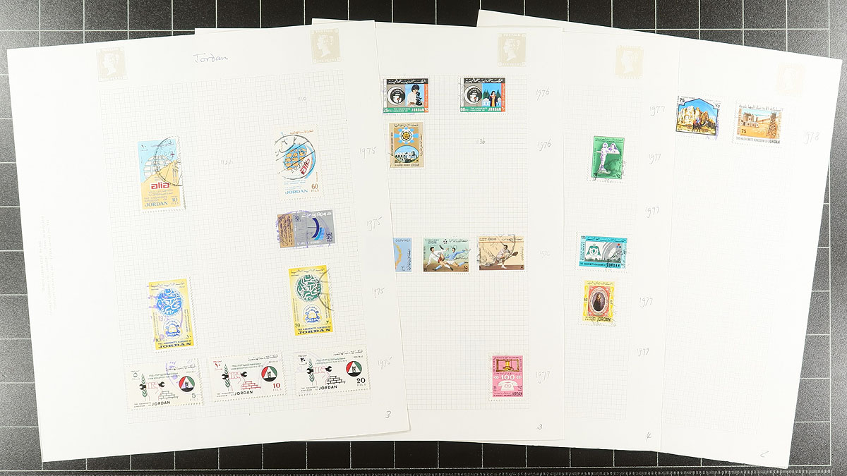 A trio of Middle Eastern countries featured in a nice mounted collection of used stamps from the 1940's to about 1978. Laid out on quadrilled pages in a near-new red Stanley Gibbons "Tower" springback binder (retails for over $50.00). The collection has been meticulously catalogued by the owner. Jordan ($250.00), Kuwait ($160.00) and Lebanon ($380.00). Condition appears to be excellent with no duplication. Total 2025 Scott US$790.00 =