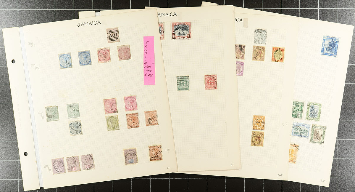 Five British Colonies (4 Africa & Jamaica) of used issues mounted on quadrilled pages and housed in an older red Stanley Gibbons "Senator" springback album. The Jamaica starts in the Victorian period, the rest with King George VI and all ends about 1978. Meticulous cataloguing by the owner: Jamaica ($226.00), Kenya, Uganda, Tanzania ($122.00), Kenya ($143.00), Lesotho ($30.00) and Malawi ($70.00). Condition appears to be excellent with little to no duplication. Total 2025 Scott US$591.00 =