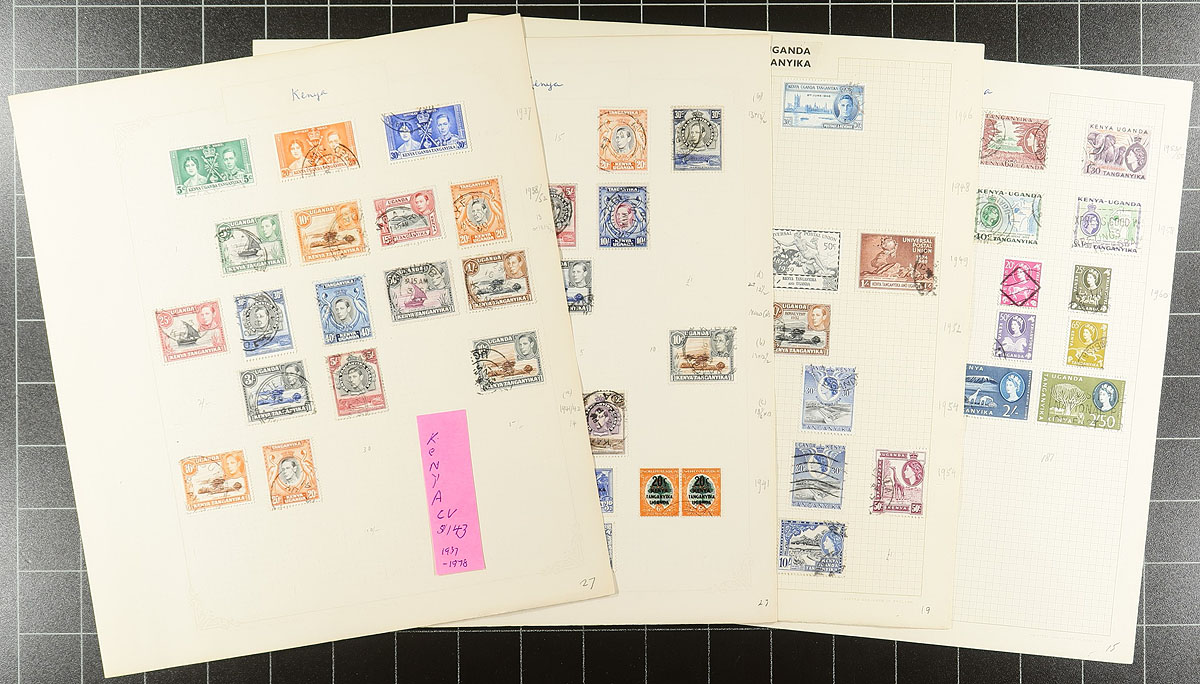 Five British Colonies (4 Africa & Jamaica) of used issues mounted on quadrilled pages and housed in an older red Stanley Gibbons "Senator" springback album. The Jamaica starts in the Victorian period, the rest with King George VI and all ends about 1978. Meticulous cataloguing by the owner: Jamaica ($226.00), Kenya, Uganda, Tanzania ($122.00), Kenya ($143.00), Lesotho ($30.00) and Malawi ($70.00). Condition appears to be excellent with little to no duplication. Total 2025 Scott US$591.00 =