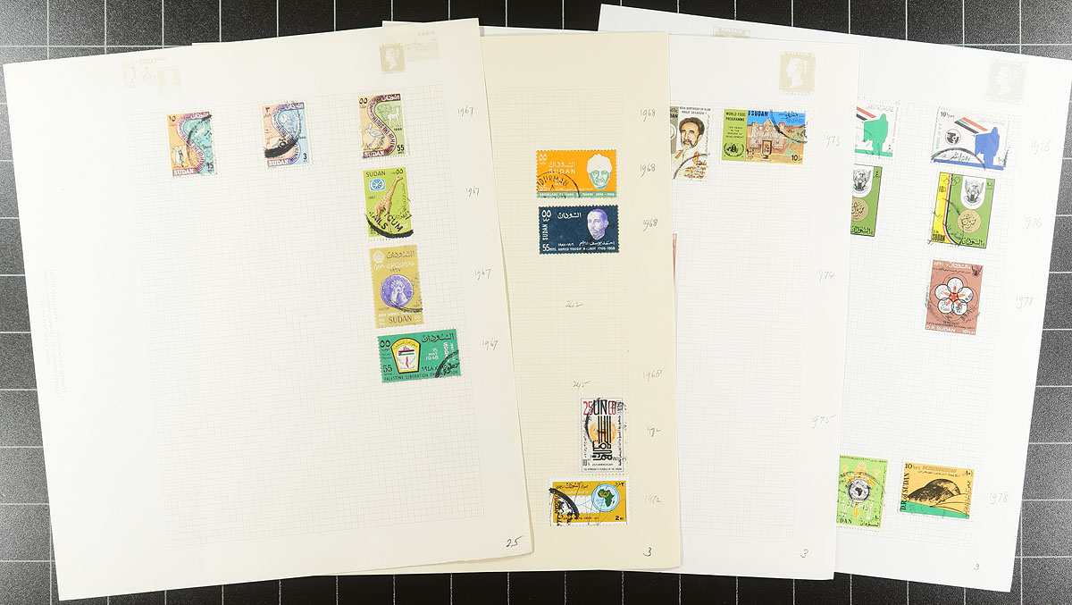 Several African colonies material from the 1940's until 1978, all mounted on quadrilled pages in a worn olive-green "Utile" springback binder. The owner has done a good job cataloguing the material, including Senegal ($30.00), Somalia ($190.00), South Africa ($245.00), Sudan ($86.00), Togo ($12.00), Tunisia ($100.00), Upper Volta (uncatalogued), Zaire ($30.00). The overall condition appears excellent with little to no duplication. The owner's conservative total 2025 Scott US$693.00 =