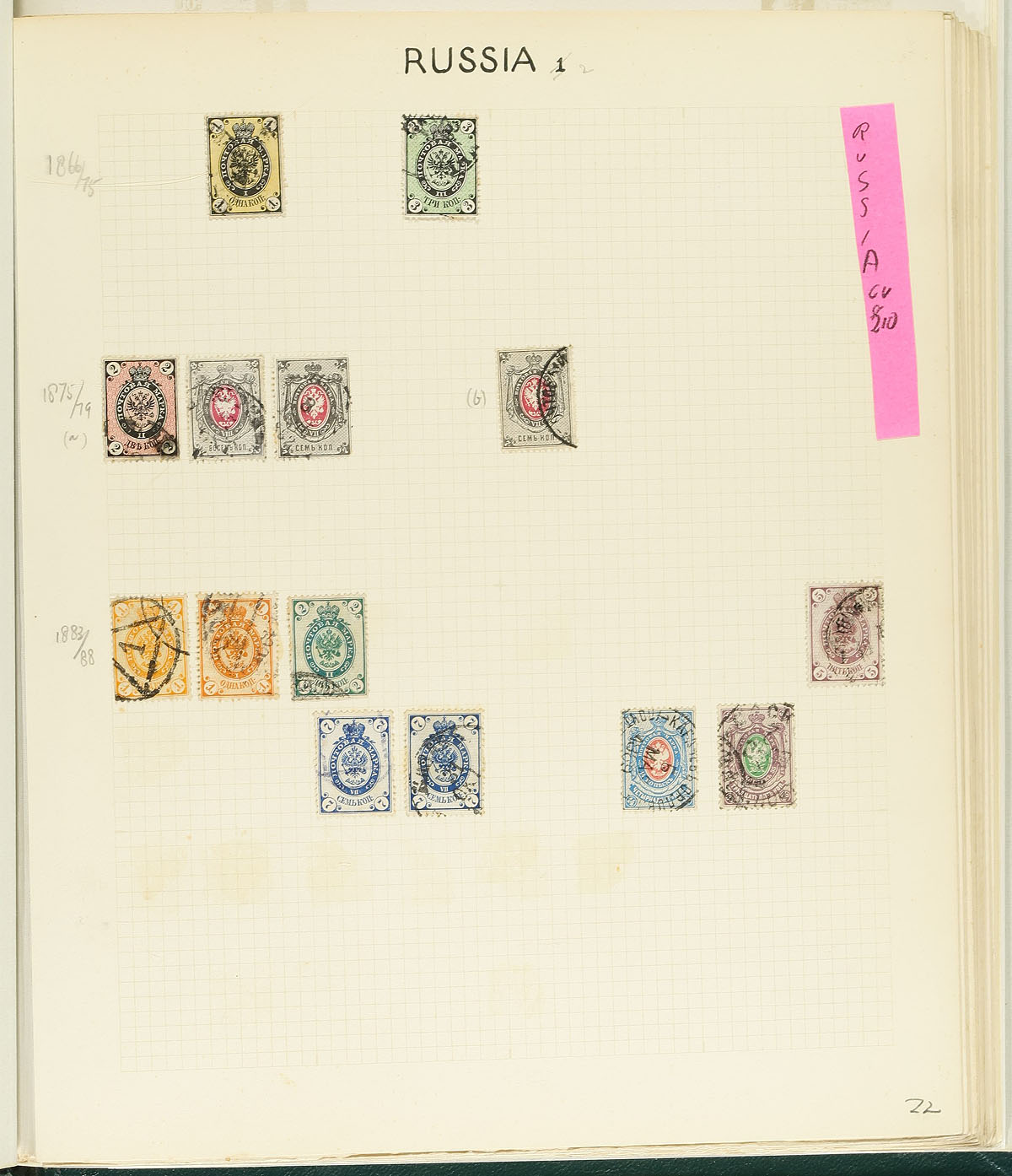 A bundle of three springback albums with used collections going back to the 19th century and then up to the mid-1970's, with Russia/USSR (catalogues $285.00), Lithuania, Czechoslovakia ($152.00) and Romania ($287.00). Condition is quite nice, and there doesn’t appear to be any duplication. One of the springback binders is a near new green Stanley Gibbons "Tower" stamp album. Total 2025 Scott US$724.00 =