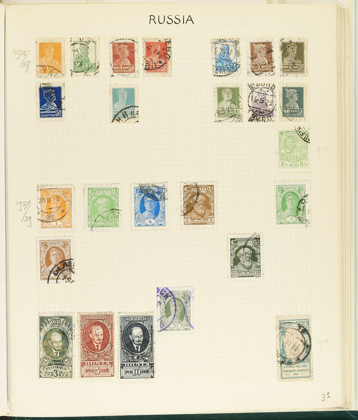 A bundle of three springback albums with used collections going back to the 19th century and then up to the mid-1970's, with Russia/USSR (catalogues $285.00), Lithuania, Czechoslovakia ($152.00) and Romania ($287.00). Condition is quite nice, and there doesn’t appear to be any duplication. One of the springback binders is a near new green Stanley Gibbons "Tower" stamp album. Total 2025 Scott US$724.00 =