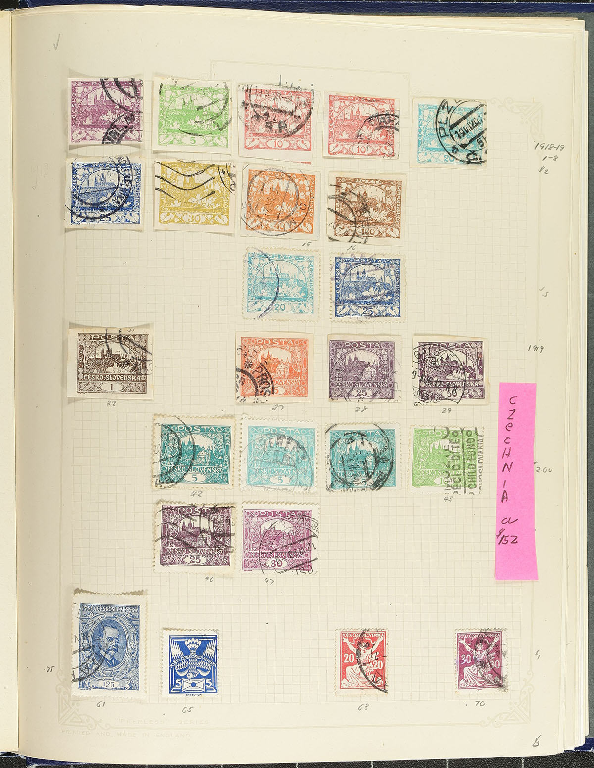 A bundle of three springback albums with used collections going back to the 19th century and then up to the mid-1970's, with Russia/USSR (catalogues $285.00), Lithuania, Czechoslovakia ($152.00) and Romania ($287.00). Condition is quite nice, and there doesn’t appear to be any duplication. One of the springback binders is a near new green Stanley Gibbons "Tower" stamp album. Total 2025 Scott US$724.00 =