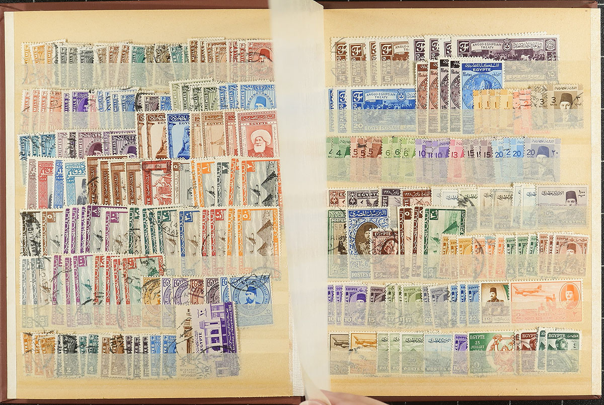 Middle East Holding. An enticing and diverse offering, in three distinct sections. Section A includes mint/used Jordan and Palestine in a small dark red stockbook, starting with Jordan, having 325 different stamps and two miniature sheets 1927-1995, then Palestine with 133 different stamps and 1 miniature sheet. Section B includes “Arab World” with a small stockbook containing 971 stamps (554 different) with one miniature sheet from several different countries including Egypt, Palestine, Jordan, Sudan, Aden, Morocco Agencies and Ethiopia. Section C is Israel, with 337 different mint and used stamps, from 1948-1994 arranged on pages and including a 1950 Israel Festival card, with stamps mounted and signed by removed stamp designer/artist Arthur Szyk. Estimate =