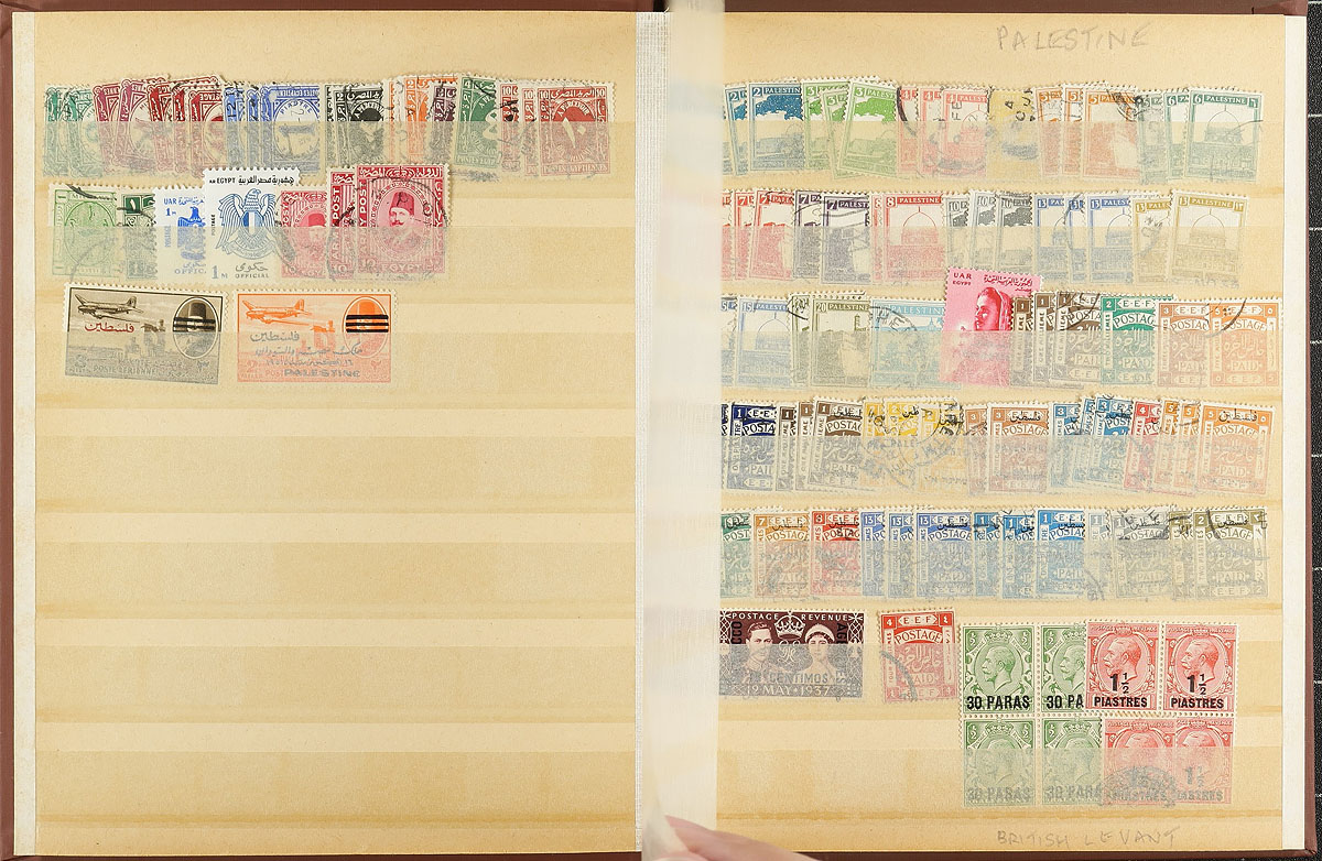 Middle East Holding. An enticing and diverse offering, in three distinct sections. Section A includes mint/used Jordan and Palestine in a small dark red stockbook, starting with Jordan, having 325 different stamps and two miniature sheets 1927-1995, then Palestine with 133 different stamps and 1 miniature sheet. Section B includes “Arab World” with a small stockbook containing 971 stamps (554 different) with one miniature sheet from several different countries including Egypt, Palestine, Jordan, Sudan, Aden, Morocco Agencies and Ethiopia. Section C is Israel, with 337 different mint and used stamps, from 1948-1994 arranged on pages and including a 1950 Israel Festival card, with stamps mounted and signed by removed stamp designer/artist Arthur Szyk. Estimate =