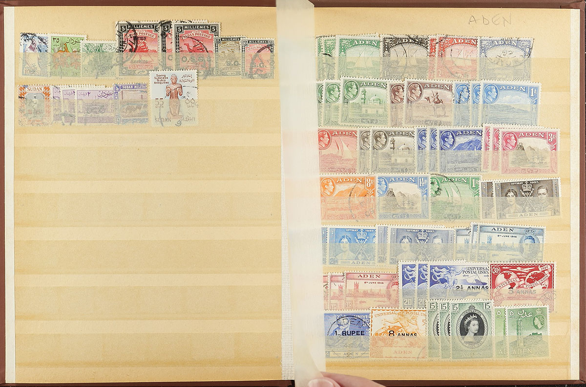 Middle East Holding. An enticing and diverse offering, in three distinct sections. Section A includes mint/used Jordan and Palestine in a small dark red stockbook, starting with Jordan, having 325 different stamps and two miniature sheets 1927-1995, then Palestine with 133 different stamps and 1 miniature sheet. Section B includes “Arab World” with a small stockbook containing 971 stamps (554 different) with one miniature sheet from several different countries including Egypt, Palestine, Jordan, Sudan, Aden, Morocco Agencies and Ethiopia. Section C is Israel, with 337 different mint and used stamps, from 1948-1994 arranged on pages and including a 1950 Israel Festival card, with stamps mounted and signed by removed stamp designer/artist Arthur Szyk. Estimate =