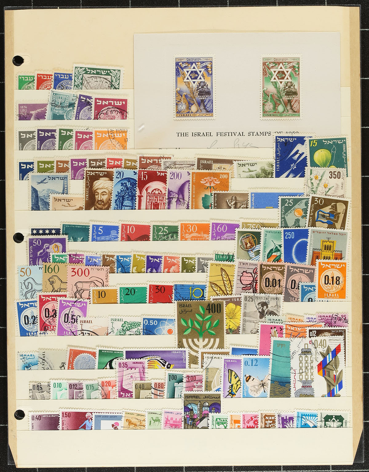 Middle East Holding. An enticing and diverse offering, in three distinct sections. Section A includes mint/used Jordan and Palestine in a small dark red stockbook, starting with Jordan, having 325 different stamps and two miniature sheets 1927-1995, then Palestine with 133 different stamps and 1 miniature sheet. Section B includes “Arab World” with a small stockbook containing 971 stamps (554 different) with one miniature sheet from several different countries including Egypt, Palestine, Jordan, Sudan, Aden, Morocco Agencies and Ethiopia. Section C is Israel, with 337 different mint and used stamps, from 1948-1994 arranged on pages and including a 1950 Israel Festival card, with stamps mounted and signed by removed stamp designer/artist Arthur Szyk. Estimate =
