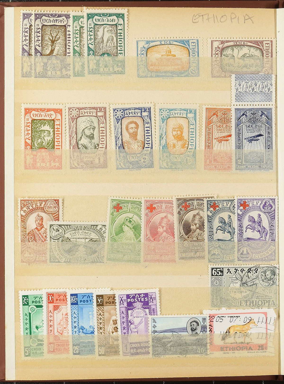 Middle East Holding. An enticing and diverse offering, in three distinct sections. Section A includes mint/used Jordan and Palestine in a small dark red stockbook, starting with Jordan, having 325 different stamps and two miniature sheets 1927-1995, then Palestine with 133 different stamps and 1 miniature sheet. Section B includes “Arab World” with a small stockbook containing 971 stamps (554 different) with one miniature sheet from several different countries including Egypt, Palestine, Jordan, Sudan, Aden, Morocco Agencies and Ethiopia. Section C is Israel, with 337 different mint and used stamps, from 1948-1994 arranged on pages and including a 1950 Israel Festival card, with stamps mounted and signed by removed stamp designer/artist Arthur Szyk. Estimate =