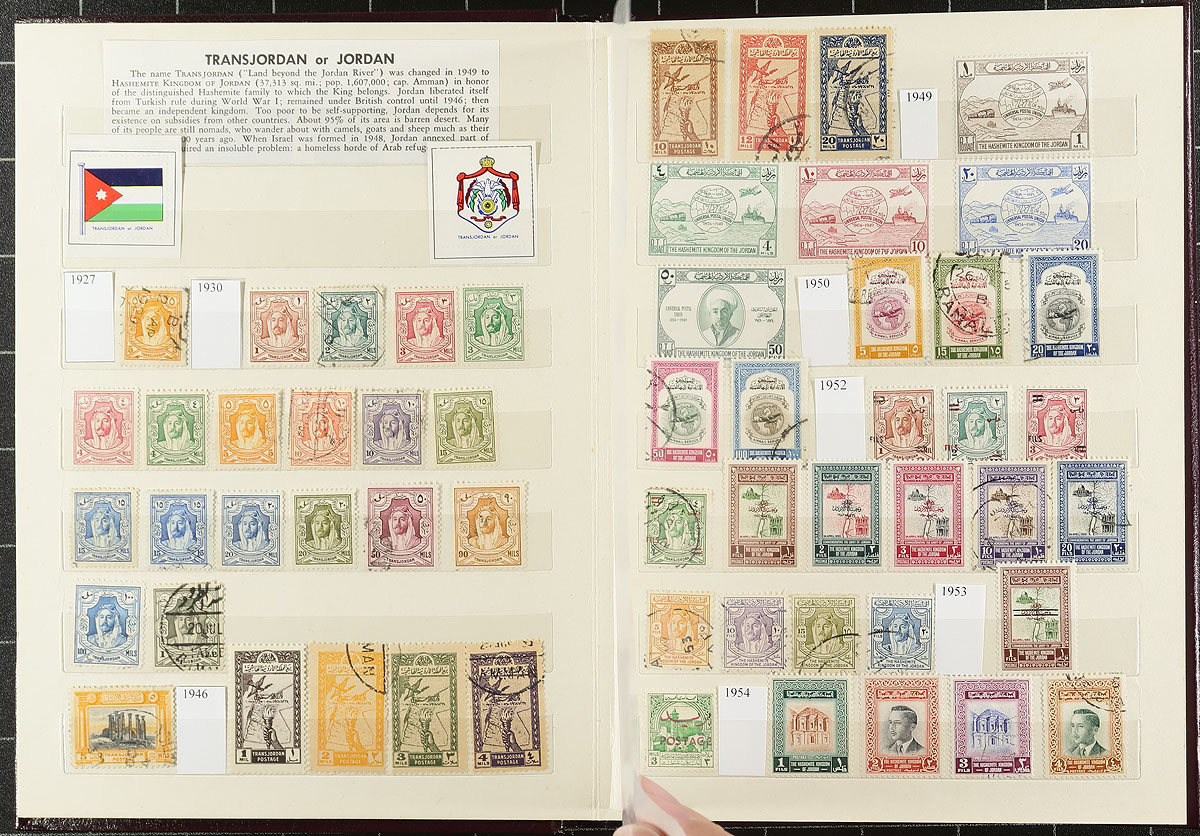 Middle East Holding. An enticing and diverse offering, in three distinct sections. Section A includes mint/used Jordan and Palestine in a small dark red stockbook, starting with Jordan, having 325 different stamps and two miniature sheets 1927-1995, then Palestine with 133 different stamps and 1 miniature sheet. Section B includes “Arab World” with a small stockbook containing 971 stamps (554 different) with one miniature sheet from several different countries including Egypt, Palestine, Jordan, Sudan, Aden, Morocco Agencies and Ethiopia. Section C is Israel, with 337 different mint and used stamps, from 1948-1994 arranged on pages and including a 1950 Israel Festival card, with stamps mounted and signed by removed stamp designer/artist Arthur Szyk. Estimate =