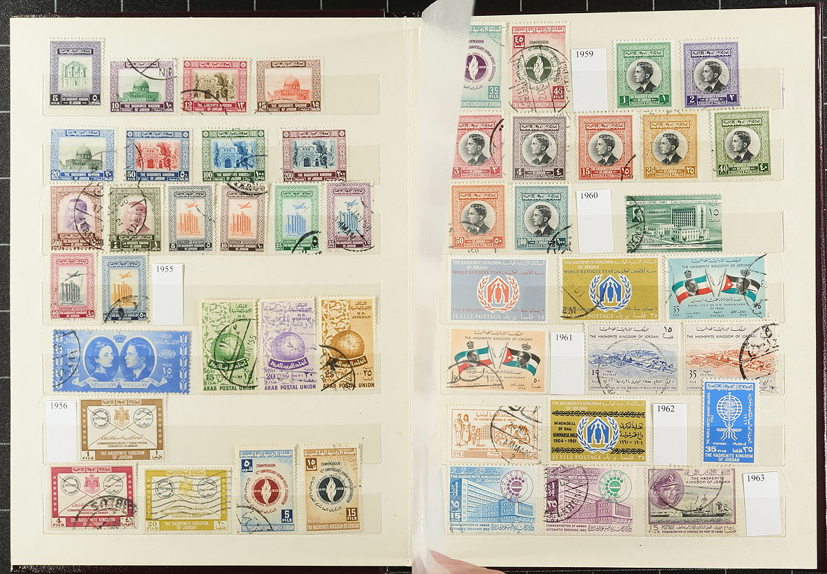 Middle East Holding. An enticing and diverse offering, in three distinct sections. Section A includes mint/used Jordan and Palestine in a small dark red stockbook, starting with Jordan, having 325 different stamps and two miniature sheets 1927-1995, then Palestine with 133 different stamps and 1 miniature sheet. Section B includes “Arab World” with a small stockbook containing 971 stamps (554 different) with one miniature sheet from several different countries including Egypt, Palestine, Jordan, Sudan, Aden, Morocco Agencies and Ethiopia. Section C is Israel, with 337 different mint and used stamps, from 1948-1994 arranged on pages and including a 1950 Israel Festival card, with stamps mounted and signed by removed stamp designer/artist Arthur Szyk. Estimate =