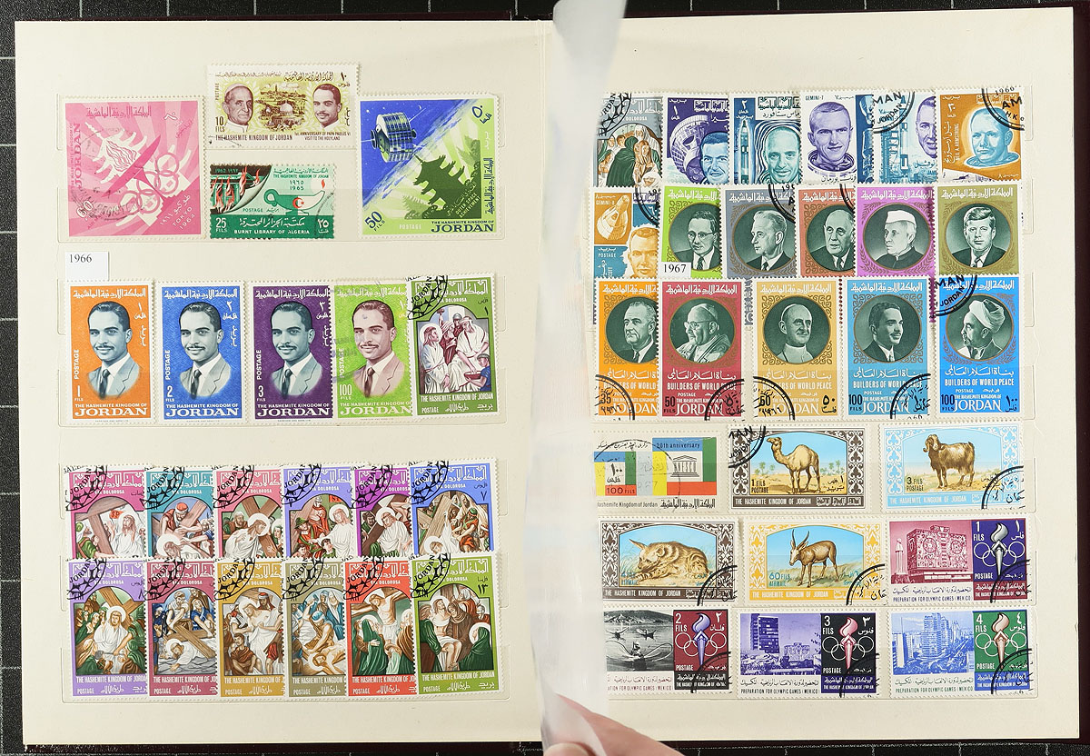 Middle East Holding. An enticing and diverse offering, in three distinct sections. Section A includes mint/used Jordan and Palestine in a small dark red stockbook, starting with Jordan, having 325 different stamps and two miniature sheets 1927-1995, then Palestine with 133 different stamps and 1 miniature sheet. Section B includes “Arab World” with a small stockbook containing 971 stamps (554 different) with one miniature sheet from several different countries including Egypt, Palestine, Jordan, Sudan, Aden, Morocco Agencies and Ethiopia. Section C is Israel, with 337 different mint and used stamps, from 1948-1994 arranged on pages and including a 1950 Israel Festival card, with stamps mounted and signed by removed stamp designer/artist Arthur Szyk. Estimate =