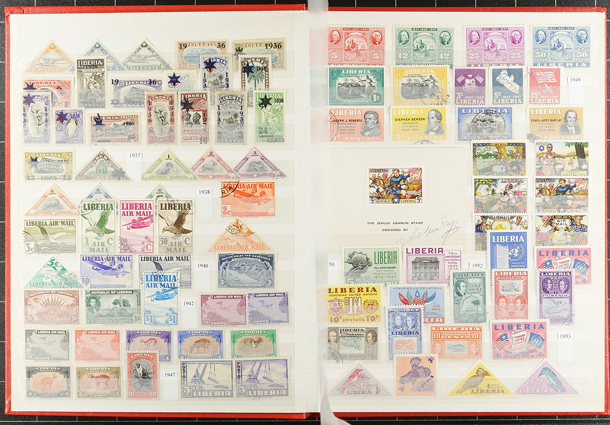 A "balance of consignment" selection of four different collections, not quite enough to make a lot individually, but as a group make for a powerful offering. Included (in no particular order) are 1) Vatican, black padded stockbook with a lifetime collection of 620 different stamps, plus one souvenir sheet from the 1929-2010 period, with both mint and used. 2) Red "Favorite Album" springback with Argentina, Bulgaria, Iran, Laos, North and South Korea with 729 different stamps neatly mounted on pages. 3) Liberia, a curated lifetime collection of mint/used/CTO with 718 different stamps and 39 miniature sheets (one of these sheets signed by the artist) in two 16-page stockbooks, with a wealth of topicals. 4) A "stamp illustrated" 16-page stockbook with Guatemala, Netherlands Indies, Indonesia and Liberia with a grand total of 737 different stamps and 2 miniature sheets. The owner has done substantial work to organize this, making these collections quite east to integrate into any existing collection. Estimate =