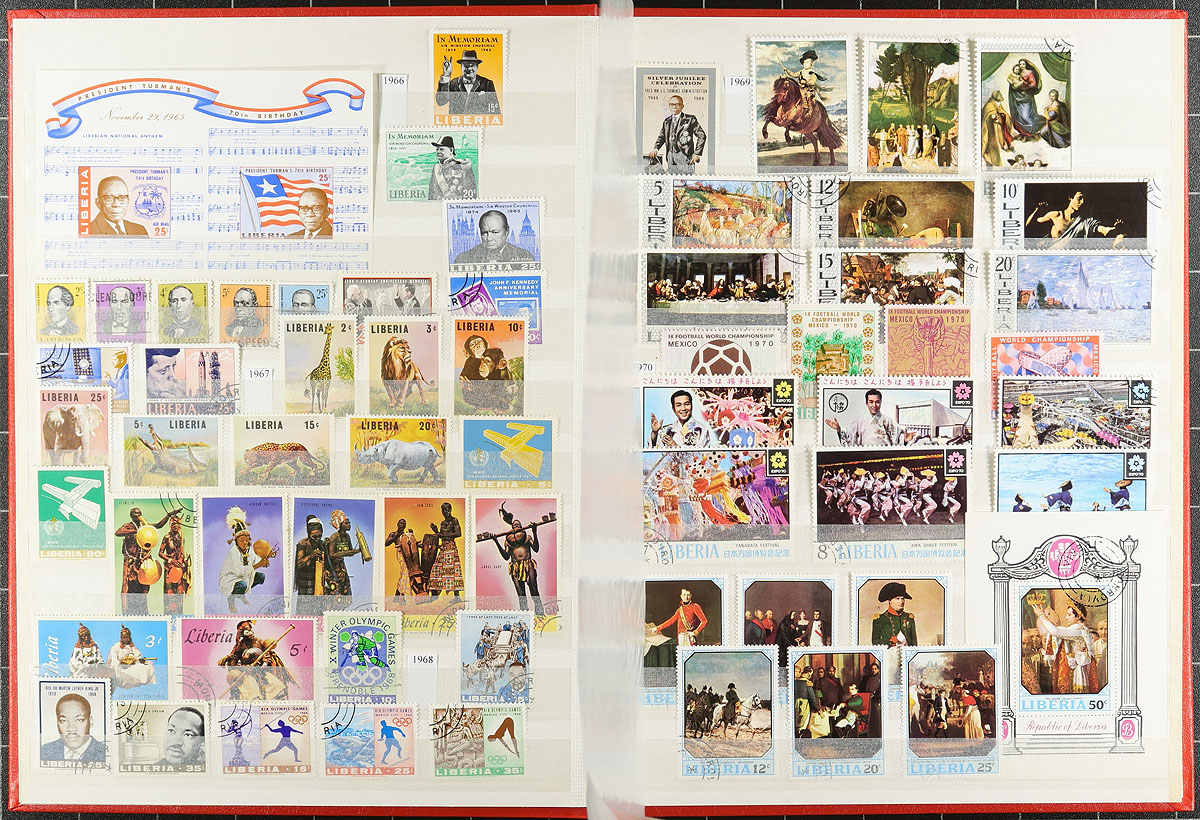 A "balance of consignment" selection of four different collections, not quite enough to make a lot individually, but as a group make for a powerful offering. Included (in no particular order) are 1) Vatican, black padded stockbook with a lifetime collection of 620 different stamps, plus one souvenir sheet from the 1929-2010 period, with both mint and used. 2) Red "Favorite Album" springback with Argentina, Bulgaria, Iran, Laos, North and South Korea with 729 different stamps neatly mounted on pages. 3) Liberia, a curated lifetime collection of mint/used/CTO with 718 different stamps and 39 miniature sheets (one of these sheets signed by the artist) in two 16-page stockbooks, with a wealth of topicals. 4) A "stamp illustrated" 16-page stockbook with Guatemala, Netherlands Indies, Indonesia and Liberia with a grand total of 737 different stamps and 2 miniature sheets. The owner has done substantial work to organize this, making these collections quite east to integrate into any existing collection. Estimate =