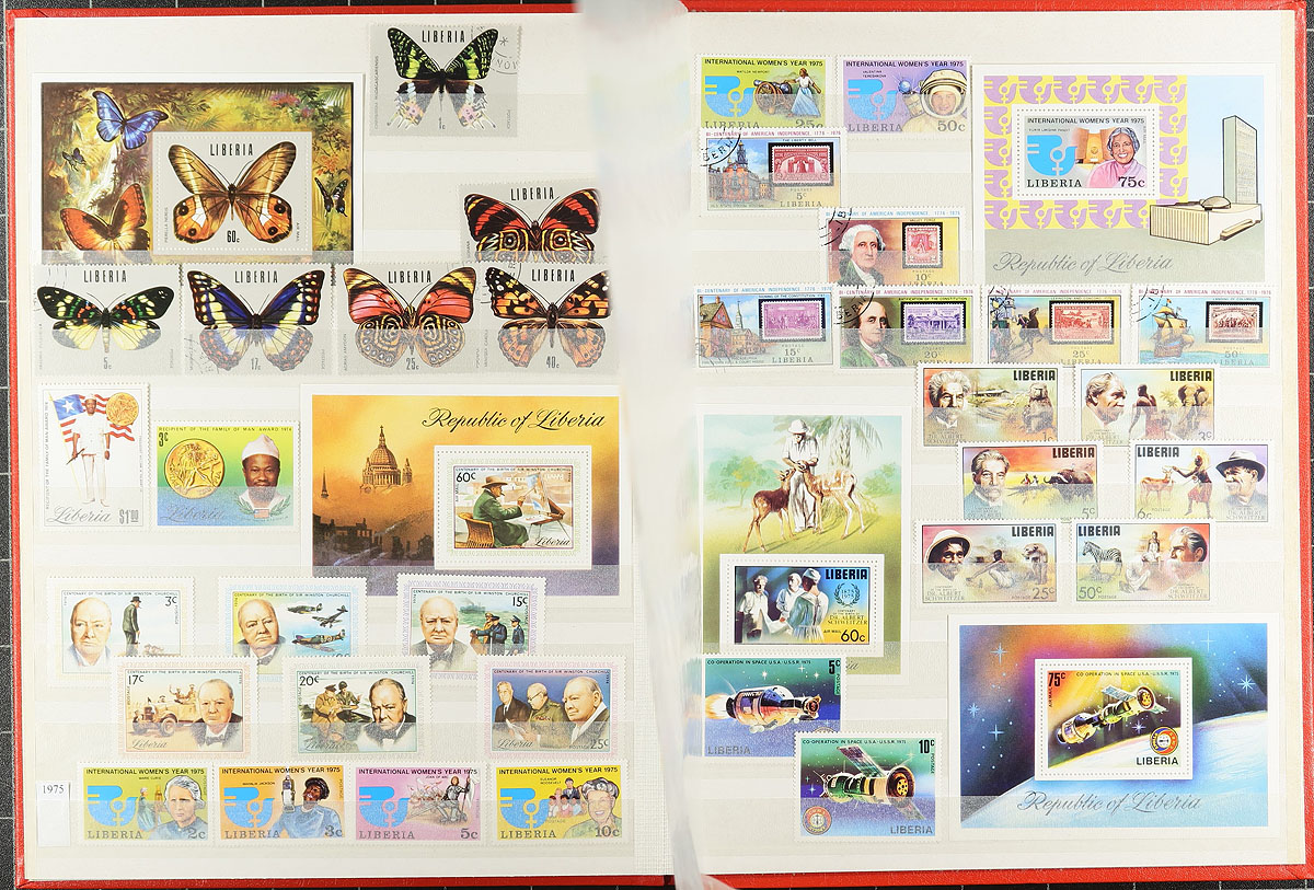 A "balance of consignment" selection of four different collections, not quite enough to make a lot individually, but as a group make for a powerful offering. Included (in no particular order) are 1) Vatican, black padded stockbook with a lifetime collection of 620 different stamps, plus one souvenir sheet from the 1929-2010 period, with both mint and used. 2) Red "Favorite Album" springback with Argentina, Bulgaria, Iran, Laos, North and South Korea with 729 different stamps neatly mounted on pages. 3) Liberia, a curated lifetime collection of mint/used/CTO with 718 different stamps and 39 miniature sheets (one of these sheets signed by the artist) in two 16-page stockbooks, with a wealth of topicals. 4) A "stamp illustrated" 16-page stockbook with Guatemala, Netherlands Indies, Indonesia and Liberia with a grand total of 737 different stamps and 2 miniature sheets. The owner has done substantial work to organize this, making these collections quite east to integrate into any existing collection. Estimate =