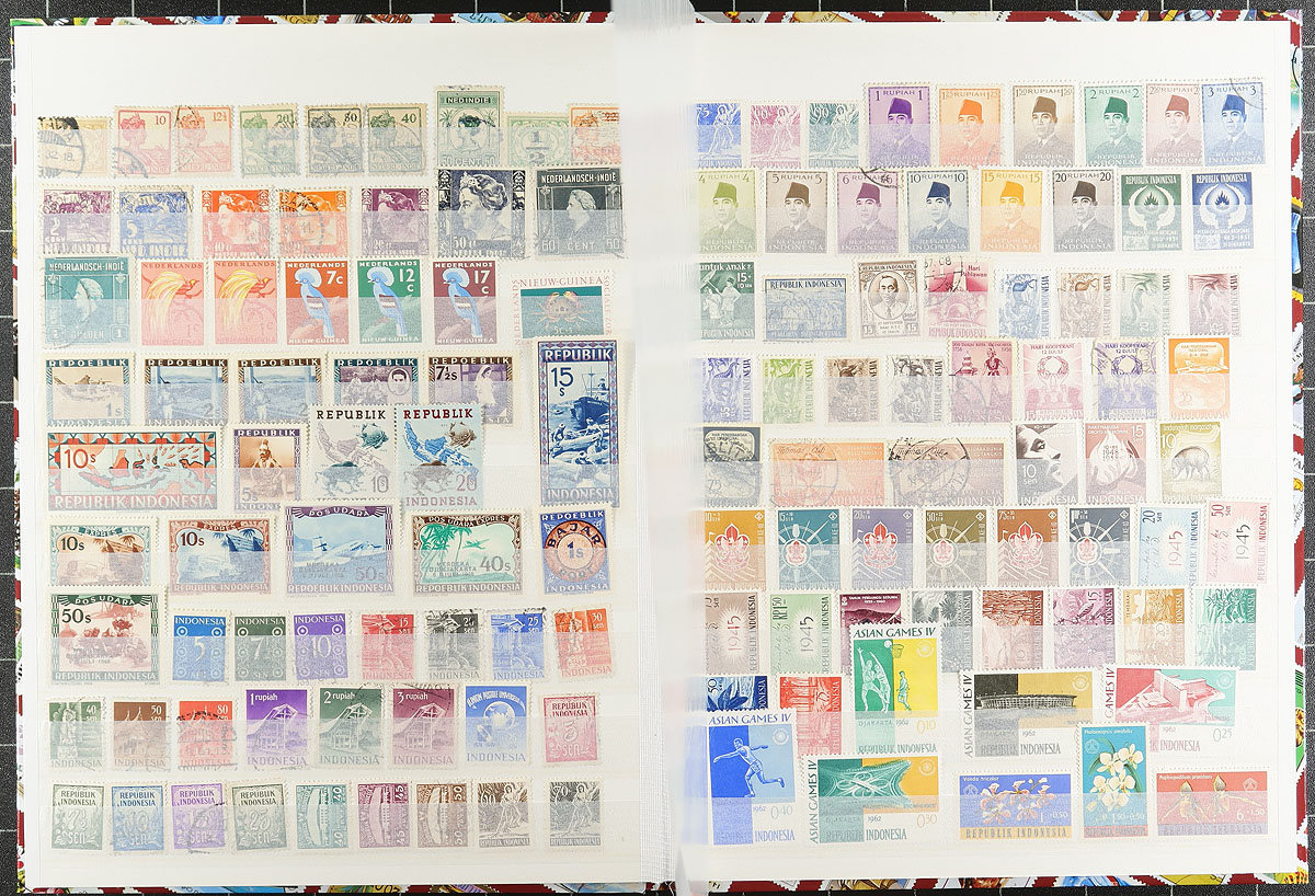 A "balance of consignment" selection of four different collections, not quite enough to make a lot individually, but as a group make for a powerful offering. Included (in no particular order) are 1) Vatican, black padded stockbook with a lifetime collection of 620 different stamps, plus one souvenir sheet from the 1929-2010 period, with both mint and used. 2) Red "Favorite Album" springback with Argentina, Bulgaria, Iran, Laos, North and South Korea with 729 different stamps neatly mounted on pages. 3) Liberia, a curated lifetime collection of mint/used/CTO with 718 different stamps and 39 miniature sheets (one of these sheets signed by the artist) in two 16-page stockbooks, with a wealth of topicals. 4) A "stamp illustrated" 16-page stockbook with Guatemala, Netherlands Indies, Indonesia and Liberia with a grand total of 737 different stamps and 2 miniature sheets. The owner has done substantial work to organize this, making these collections quite east to integrate into any existing collection. Estimate =