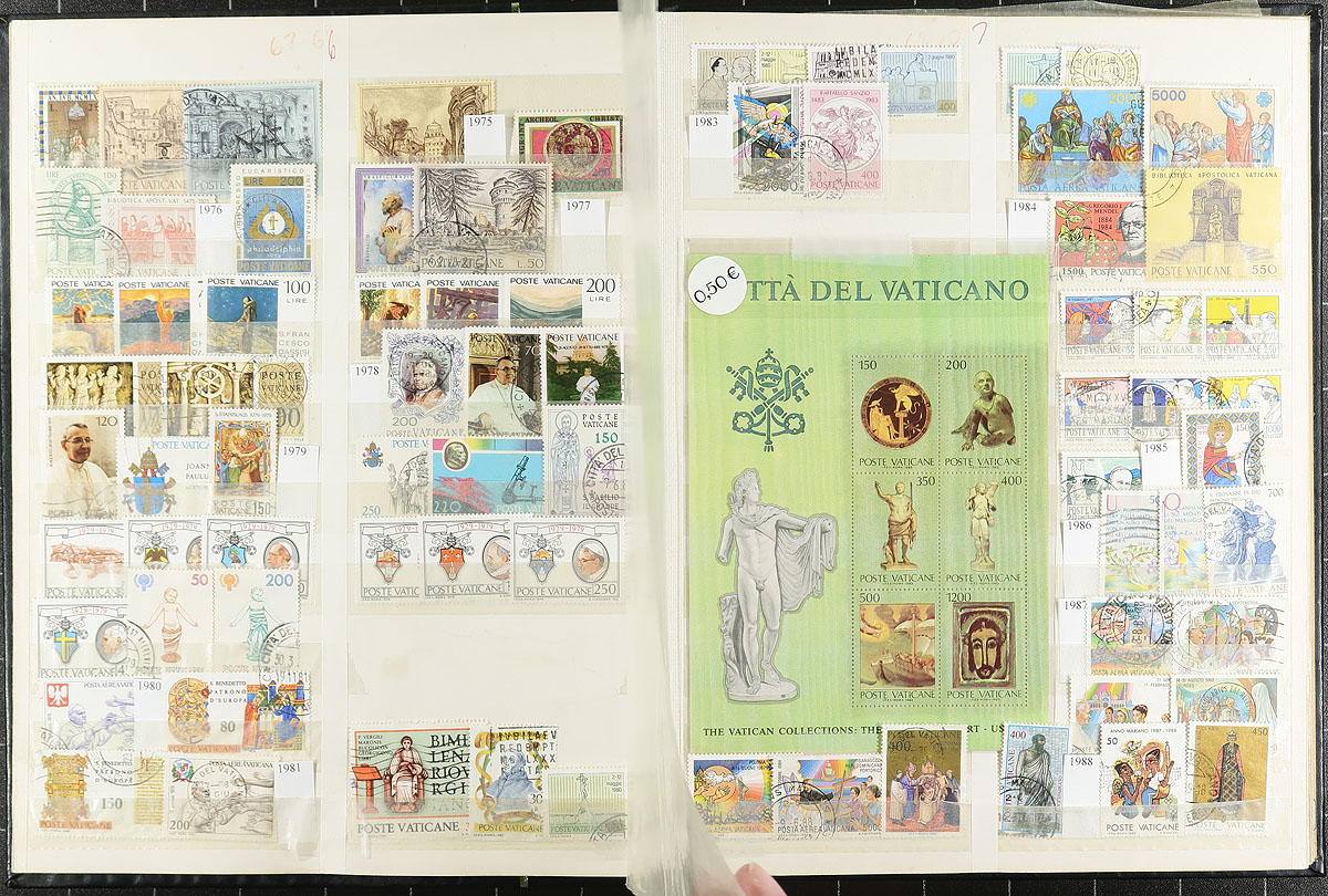 A "balance of consignment" selection of four different collections, not quite enough to make a lot individually, but as a group make for a powerful offering. Included (in no particular order) are 1) Vatican, black padded stockbook with a lifetime collection of 620 different stamps, plus one souvenir sheet from the 1929-2010 period, with both mint and used. 2) Red "Favorite Album" springback with Argentina, Bulgaria, Iran, Laos, North and South Korea with 729 different stamps neatly mounted on pages. 3) Liberia, a curated lifetime collection of mint/used/CTO with 718 different stamps and 39 miniature sheets (one of these sheets signed by the artist) in two 16-page stockbooks, with a wealth of topicals. 4) A "stamp illustrated" 16-page stockbook with Guatemala, Netherlands Indies, Indonesia and Liberia with a grand total of 737 different stamps and 2 miniature sheets. The owner has done substantial work to organize this, making these collections quite east to integrate into any existing collection. Estimate =