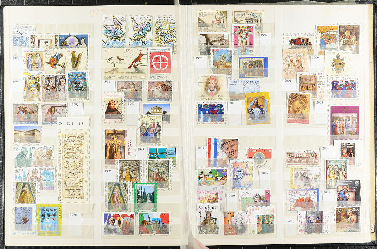 A "balance of consignment" selection of four different collections, not quite enough to make a lot individually, but as a group make for a powerful offering. Included (in no particular order) are 1) Vatican, black padded stockbook with a lifetime collection of 620 different stamps, plus one souvenir sheet from the 1929-2010 period, with both mint and used. 2) Red "Favorite Album" springback with Argentina, Bulgaria, Iran, Laos, North and South Korea with 729 different stamps neatly mounted on pages. 3) Liberia, a curated lifetime collection of mint/used/CTO with 718 different stamps and 39 miniature sheets (one of these sheets signed by the artist) in two 16-page stockbooks, with a wealth of topicals. 4) A "stamp illustrated" 16-page stockbook with Guatemala, Netherlands Indies, Indonesia and Liberia with a grand total of 737 different stamps and 2 miniature sheets. The owner has done substantial work to organize this, making these collections quite east to integrate into any existing collection. Estimate =
