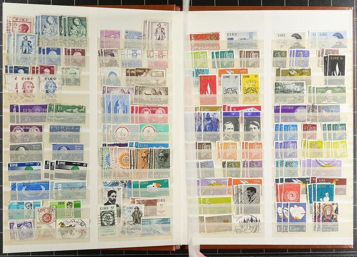 European strong holding, in four distinct portions. A combination group of four different collections, all from the same consignor with an eye for detail. Portion A includes Monaco, with 532 stamps (466 different) and 2 miniature sheets, mostly mint from 1891-1977 on stockpages. Portion B is Ireland 1922-2009 in a 16-page Unisafe stockbook with 811 stamps (403 different), mostly used. Portion C is Belgium and Colonies 1865-1998 with Belgium having 579 different, and "Colonies" having 201 different, mostly used on stockpages in a binder. Lastly, Portion D comprises of Portugal and Spain on pages within a binder, with Portugal having 421 stamps (280 different) 1855-2001 mostly used including "back of the book" and Spain having 734 stamps (520 different) mostly used from 1862-2008). A very clean offering. Estimate =