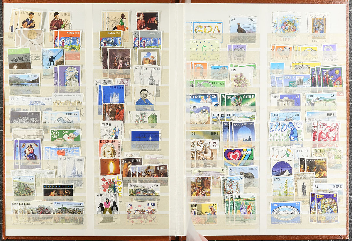 European strong holding, in four distinct portions. A combination group of four different collections, all from the same consignor with an eye for detail. Portion A includes Monaco, with 532 stamps (466 different) and 2 miniature sheets, mostly mint from 1891-1977 on stockpages. Portion B is Ireland 1922-2009 in a 16-page Unisafe stockbook with 811 stamps (403 different), mostly used. Portion C is Belgium and Colonies 1865-1998 with Belgium having 579 different, and "Colonies" having 201 different, mostly used on stockpages in a binder. Lastly, Portion D comprises of Portugal and Spain on pages within a binder, with Portugal having 421 stamps (280 different) 1855-2001 mostly used including "back of the book" and Spain having 734 stamps (520 different) mostly used from 1862-2008). A very clean offering. Estimate =
