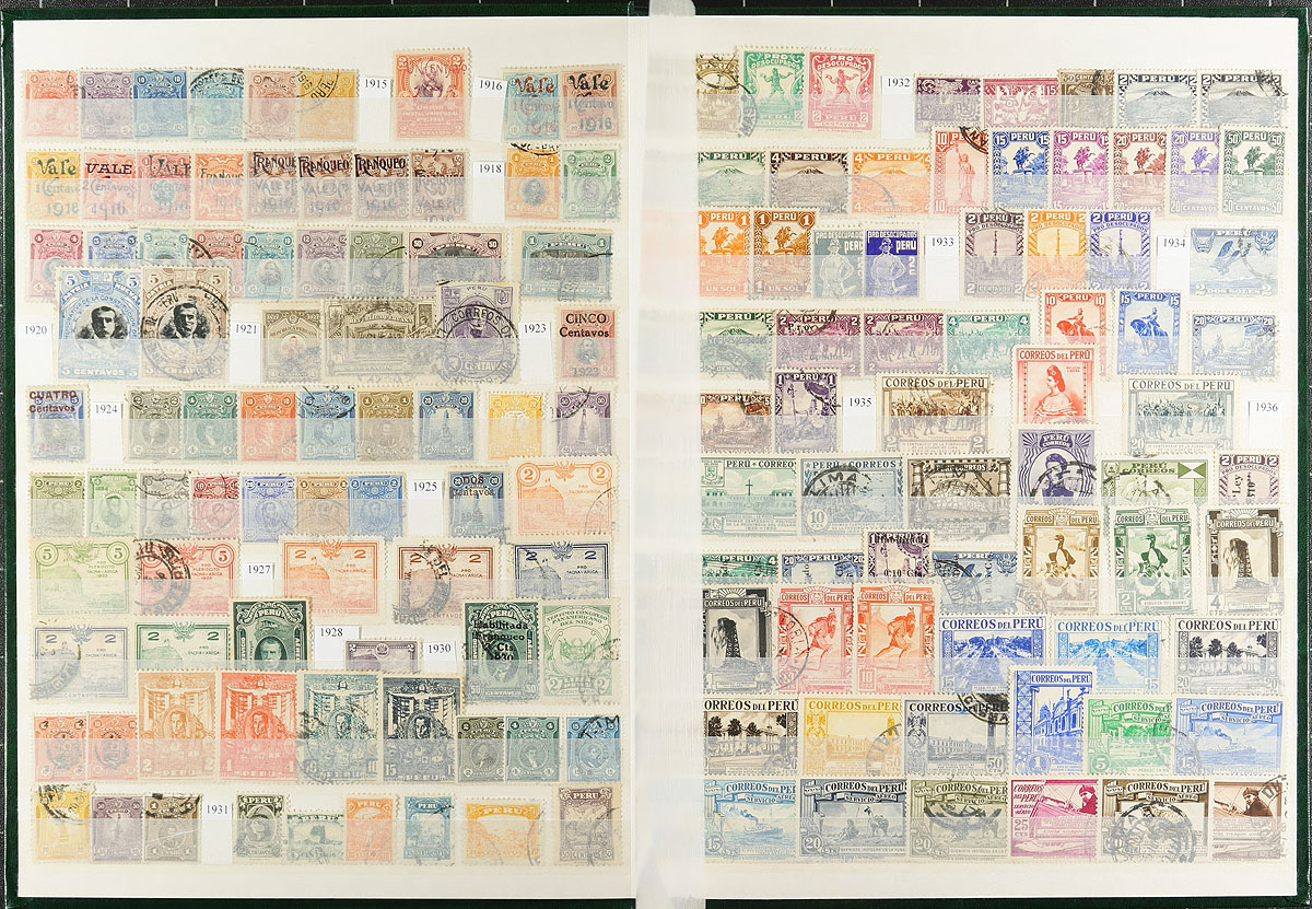 Peru & Bolivia Holdings. A duo of Uni-Safe brand 16-page stockbooks, containing (respectively) Peru and Bolivia. The Peruvian stockbook contains a lifetime collection of 740 different mostly used from 1858-2010. The Bolivian stockbook contains a lifetime collection of 706 different stamps, plus two miniature sheets, mint and (mostly) used 1887-2007. Meticulously organized, with two premium stockbooks! Estimate =