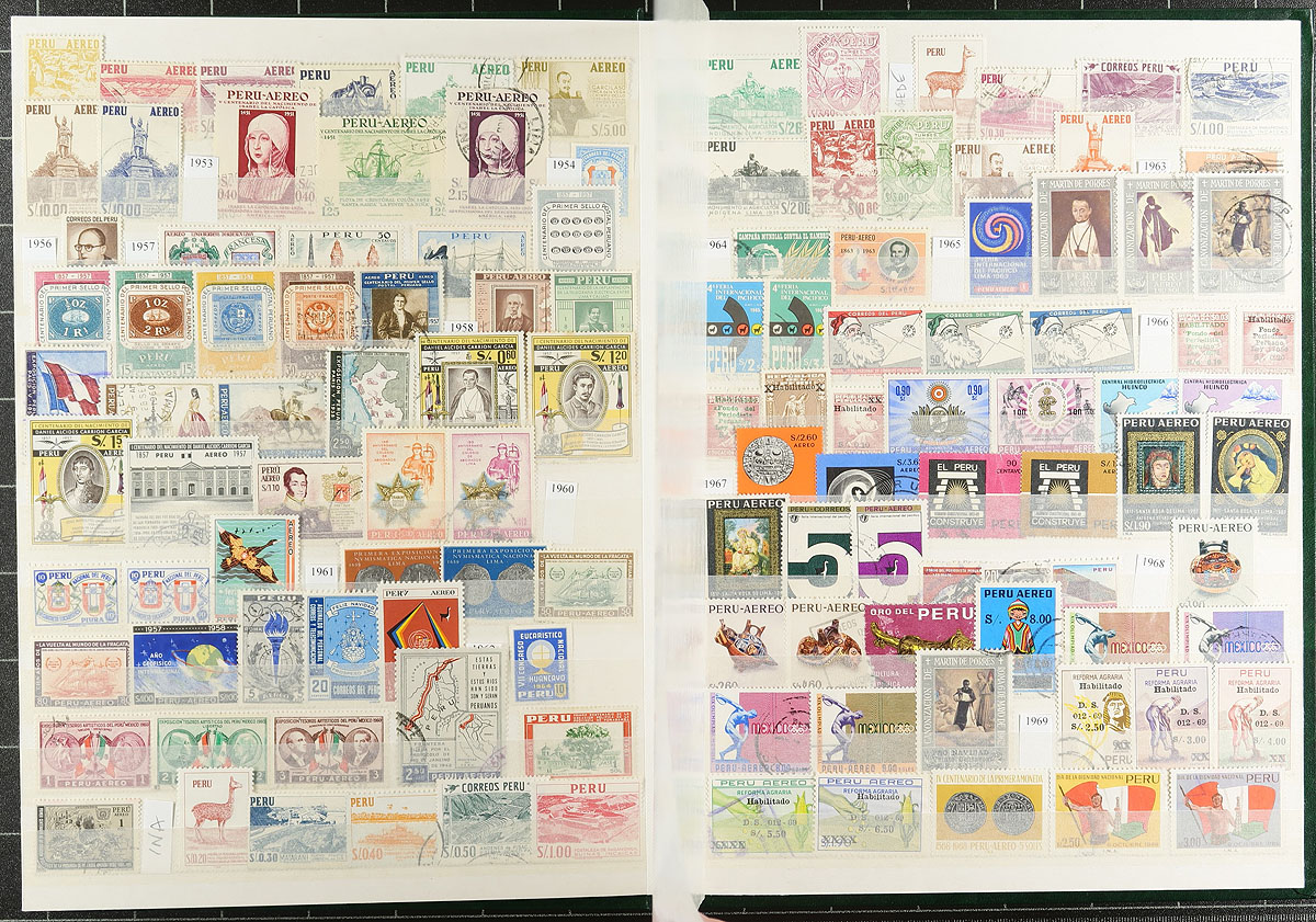 Peru & Bolivia Holdings. A duo of Uni-Safe brand 16-page stockbooks, containing (respectively) Peru and Bolivia. The Peruvian stockbook contains a lifetime collection of 740 different mostly used from 1858-2010. The Bolivian stockbook contains a lifetime collection of 706 different stamps, plus two miniature sheets, mint and (mostly) used 1887-2007. Meticulously organized, with two premium stockbooks! Estimate =