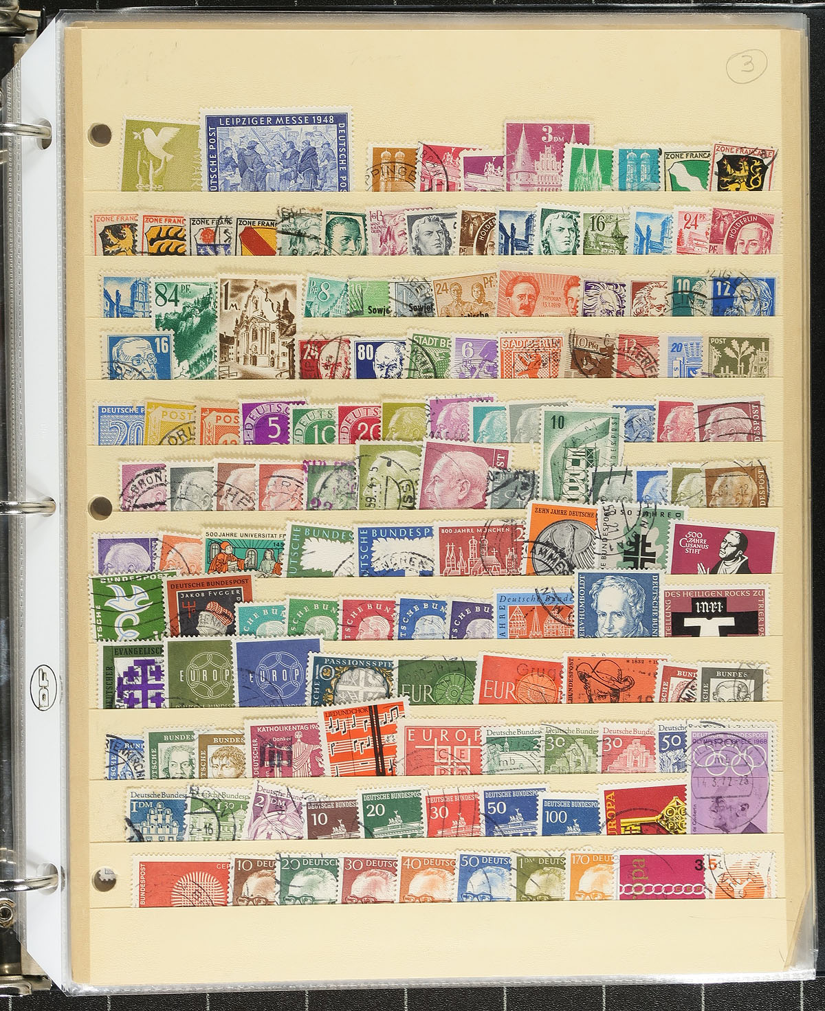 A Germany strong collector’s holding, with a bit of Austria, organized into three individual albums and distinct collections. In no particular order, the lot includes 1) Germany (plus a few earlier "states" 1867-2014 collection of 1386 different stamps, plus 8 covers/postcards and 2 miniature sheets on pages within a binder, mostly used. 2) Germany, West Germany, Berlin & DDR 1872-2024, mostly used, with 2559 stamps (1543 different) plus 2 miniature sheets within a 16-page Unisafe brand stockbook. 3) Austria and Germany, in a 16-page Lighthouse stockbook (stockbook has seen better days) with Austria 1863-1979 with 1003 stamps (562 different) plus 4 miniature sheets, and Germany (Berlin 1960-1978, Germany 2006-2010, DDR 1950-1959) plus Bavaria, Bohemia and Moravia, Saar, Schleswig and Wurttemberg and OCCUPATION issues of Ukraine, Belgium and Morocco with a total of 1803 stamps (1175 different). A very useful holding, exceptionally organized. Estimate =