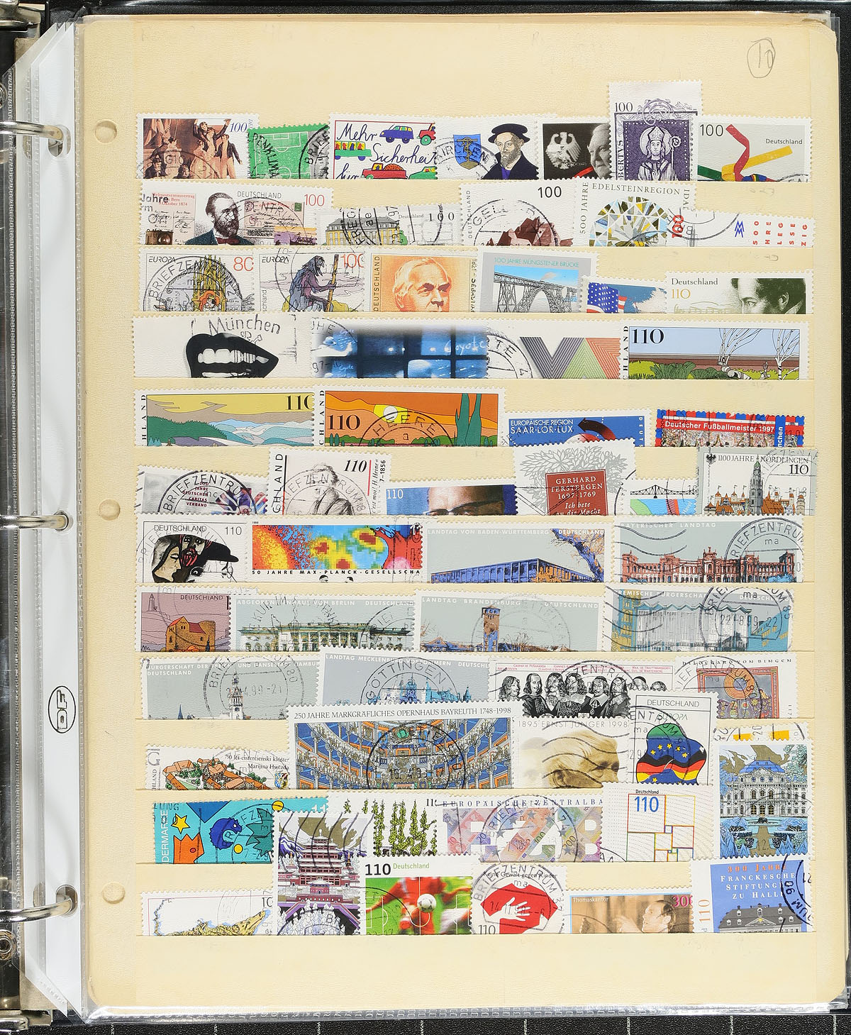 A Germany strong collector’s holding, with a bit of Austria, organized into three individual albums and distinct collections. In no particular order, the lot includes 1) Germany (plus a few earlier "states" 1867-2014 collection of 1386 different stamps, plus 8 covers/postcards and 2 miniature sheets on pages within a binder, mostly used. 2) Germany, West Germany, Berlin & DDR 1872-2024, mostly used, with 2559 stamps (1543 different) plus 2 miniature sheets within a 16-page Unisafe brand stockbook. 3) Austria and Germany, in a 16-page Lighthouse stockbook (stockbook has seen better days) with Austria 1863-1979 with 1003 stamps (562 different) plus 4 miniature sheets, and Germany (Berlin 1960-1978, Germany 2006-2010, DDR 1950-1959) plus Bavaria, Bohemia and Moravia, Saar, Schleswig and Wurttemberg and OCCUPATION issues of Ukraine, Belgium and Morocco with a total of 1803 stamps (1175 different). A very useful holding, exceptionally organized. Estimate =