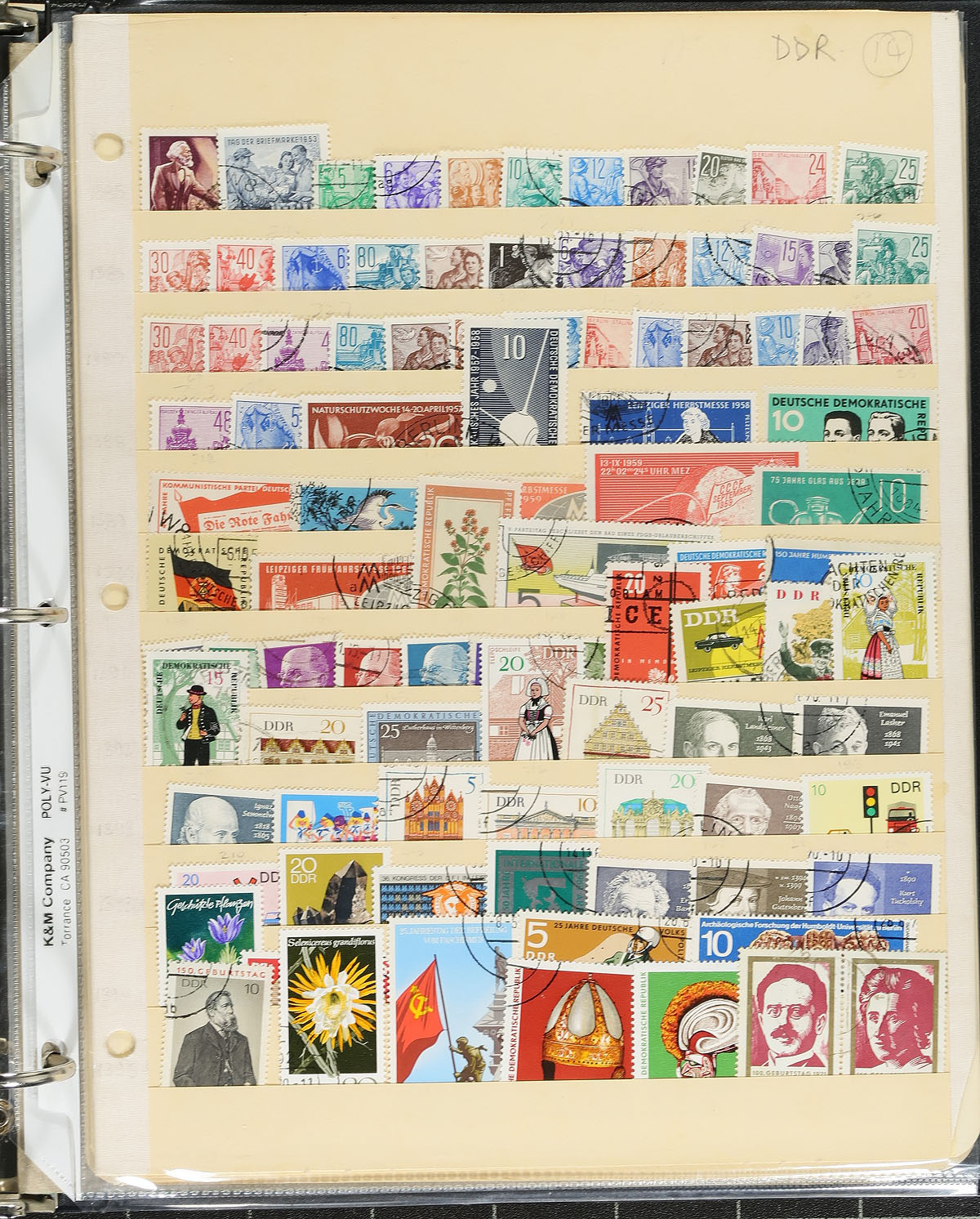 A Germany strong collector’s holding, with a bit of Austria, organized into three individual albums and distinct collections. In no particular order, the lot includes 1) Germany (plus a few earlier "states" 1867-2014 collection of 1386 different stamps, plus 8 covers/postcards and 2 miniature sheets on pages within a binder, mostly used. 2) Germany, West Germany, Berlin & DDR 1872-2024, mostly used, with 2559 stamps (1543 different) plus 2 miniature sheets within a 16-page Unisafe brand stockbook. 3) Austria and Germany, in a 16-page Lighthouse stockbook (stockbook has seen better days) with Austria 1863-1979 with 1003 stamps (562 different) plus 4 miniature sheets, and Germany (Berlin 1960-1978, Germany 2006-2010, DDR 1950-1959) plus Bavaria, Bohemia and Moravia, Saar, Schleswig and Wurttemberg and OCCUPATION issues of Ukraine, Belgium and Morocco with a total of 1803 stamps (1175 different). A very useful holding, exceptionally organized. Estimate =