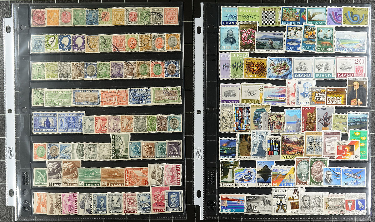Scandinavian Delight. A duo of country collections, including Iceland with 353 different mostly used stamps from "earlies to 1999" arranged on stockpages. This if followed by an attractive mostly used collection of Sweden 1858-2010 with 1235 stamps (643 different) plus a half-sheet of Officials, on manila pages. Estimate =