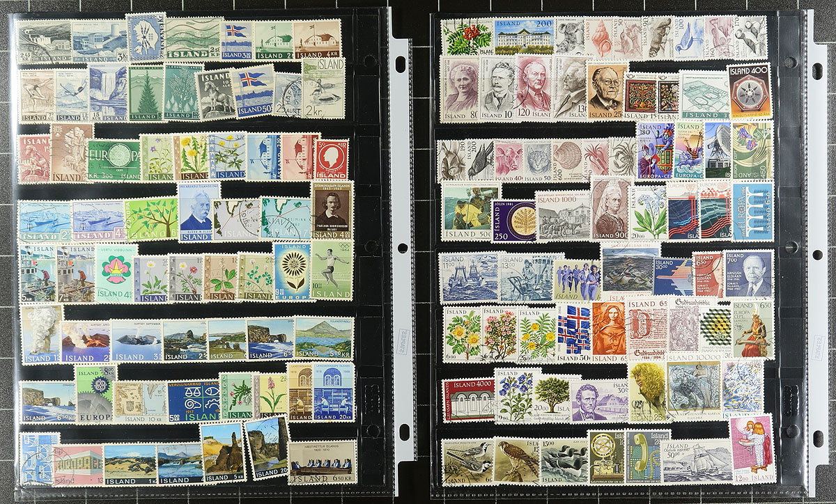 Scandinavian Delight. A duo of country collections, including Iceland with 353 different mostly used stamps from "earlies to 1999" arranged on stockpages. This if followed by an attractive mostly used collection of Sweden 1858-2010 with 1235 stamps (643 different) plus a half-sheet of Officials, on manila pages. Estimate =