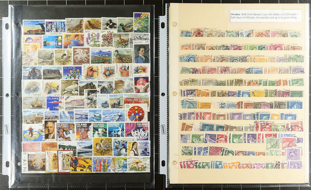 Scandinavian Delight. A duo of country collections, including Iceland with 353 different mostly used stamps from "earlies to 1999" arranged on stockpages. This if followed by an attractive mostly used collection of Sweden 1858-2010 with 1235 stamps (643 different) plus a half-sheet of Officials, on manila pages. Estimate =