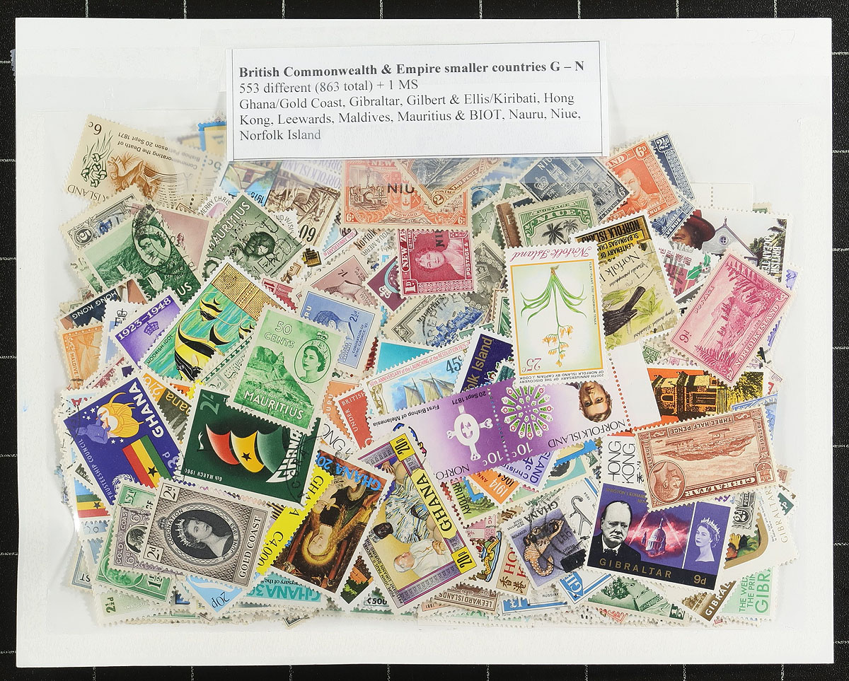 An interesting collector’s holding of British Commonwealh. Starting with a blue springback album with British Central and Southern Africa, mint and used with about 550 different (1012 stamps in total) with strength in Rhodesias, South Africa, but also notable Basutoland, Bechuanaland, Malawi, Nigeria, Nyasaland, SW Africa, Swaziland, Zambia, Zimbabwe and Zululand, plus a half-sheet of Northern Rhodesia 1948 1 ½ d Silver Jubilee, Gambia "cars" in strips. This album in nicely complemented by three packages "British Commonwealth and Empire, smaller countries" of "A to Z" mint and used, with over 2100 stamps, and consignor noting there are 1329 different stamps within these packages. The perfect group for a collector to sort out and compare against their own holdings. Estimate =