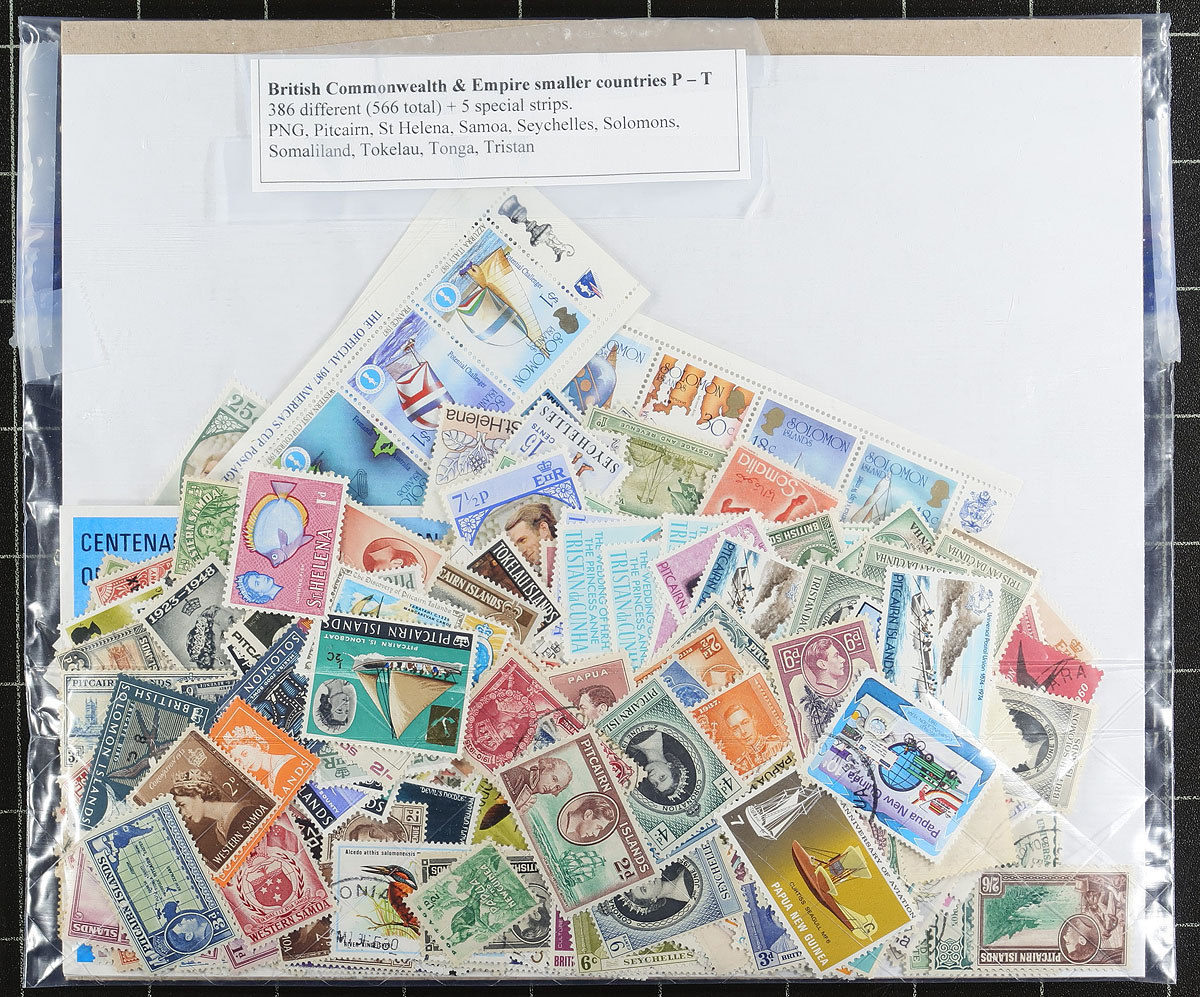 An interesting collector’s holding of British Commonwealh. Starting with a blue springback album with British Central and Southern Africa, mint and used with about 550 different (1012 stamps in total) with strength in Rhodesias, South Africa, but also notable Basutoland, Bechuanaland, Malawi, Nigeria, Nyasaland, SW Africa, Swaziland, Zambia, Zimbabwe and Zululand, plus a half-sheet of Northern Rhodesia 1948 1 ½ d Silver Jubilee, Gambia "cars" in strips. This album in nicely complemented by three packages "British Commonwealth and Empire, smaller countries" of "A to Z" mint and used, with over 2100 stamps, and consignor noting there are 1329 different stamps within these packages. The perfect group for a collector to sort out and compare against their own holdings. Estimate =