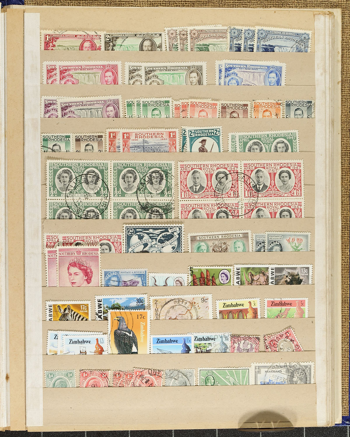 An interesting collector’s holding of British Commonwealh. Starting with a blue springback album with British Central and Southern Africa, mint and used with about 550 different (1012 stamps in total) with strength in Rhodesias, South Africa, but also notable Basutoland, Bechuanaland, Malawi, Nigeria, Nyasaland, SW Africa, Swaziland, Zambia, Zimbabwe and Zululand, plus a half-sheet of Northern Rhodesia 1948 1 ½ d Silver Jubilee, Gambia "cars" in strips. This album in nicely complemented by three packages "British Commonwealth and Empire, smaller countries" of "A to Z" mint and used, with over 2100 stamps, and consignor noting there are 1329 different stamps within these packages. The perfect group for a collector to sort out and compare against their own holdings. Estimate =
