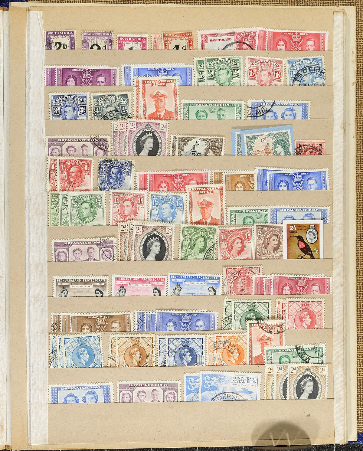 An interesting collector’s holding of British Commonwealh. Starting with a blue springback album with British Central and Southern Africa, mint and used with about 550 different (1012 stamps in total) with strength in Rhodesias, South Africa, but also notable Basutoland, Bechuanaland, Malawi, Nigeria, Nyasaland, SW Africa, Swaziland, Zambia, Zimbabwe and Zululand, plus a half-sheet of Northern Rhodesia 1948 1 ½ d Silver Jubilee, Gambia "cars" in strips. This album in nicely complemented by three packages "British Commonwealth and Empire, smaller countries" of "A to Z" mint and used, with over 2100 stamps, and consignor noting there are 1329 different stamps within these packages. The perfect group for a collector to sort out and compare against their own holdings. Estimate =