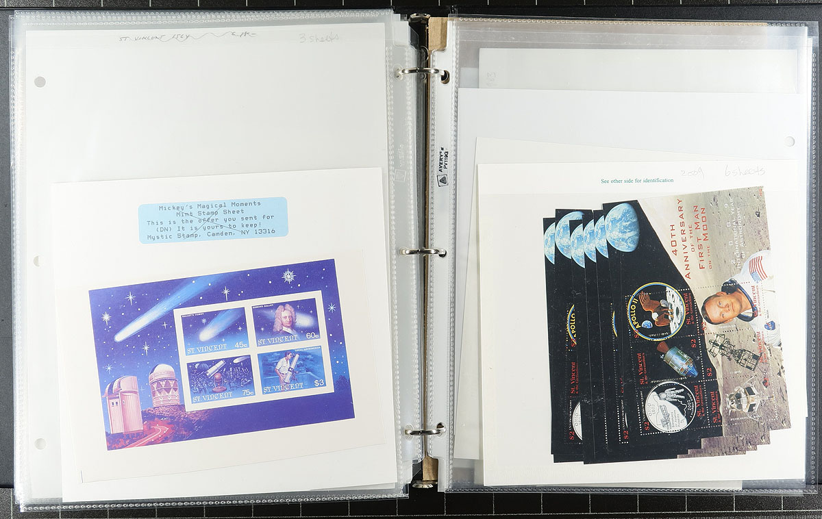 A worthwhile holding of British West Indies, starting with a bulging black binder fill of miniature sheets, sheets, multiples and booklets with a wild-ride of topical interest including Marilyn, Diana, Royalty and Disney. This is nicely complemented by a large bag containing 18 neatly organized packets (by country) of 5426 stamps (2306 different) from 18 different countries. Take a look at the owner listed inventory of the packets to appreciate the scope of the lot. Estimate =