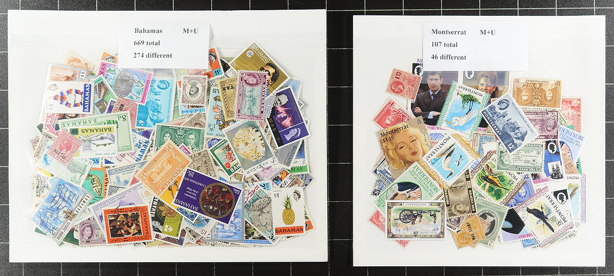A worthwhile holding of British West Indies, starting with a bulging black binder fill of miniature sheets, sheets, multiples and booklets with a wild-ride of topical interest including Marilyn, Diana, Royalty and Disney. This is nicely complemented by a large bag containing 18 neatly organized packets (by country) of 5426 stamps (2306 different) from 18 different countries. Take a look at the owner listed inventory of the packets to appreciate the scope of the lot. Estimate =