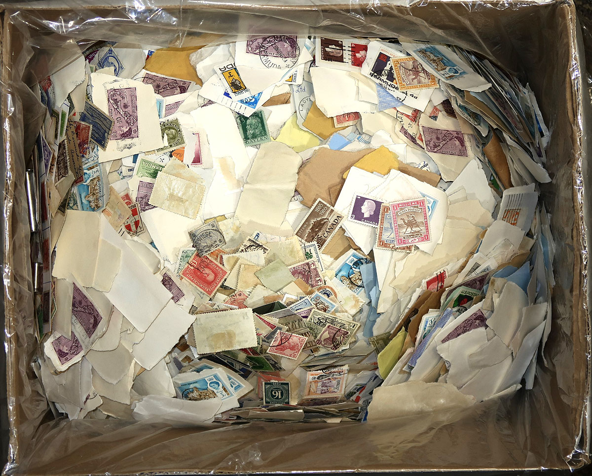 Bankers Box about 2/3 filled with 8lb of worldwide on-paper / off-paper stamps, seemingly spanning the globe. An interesting sort that should keep you busy over at least a few wintery weekends. Estimate =