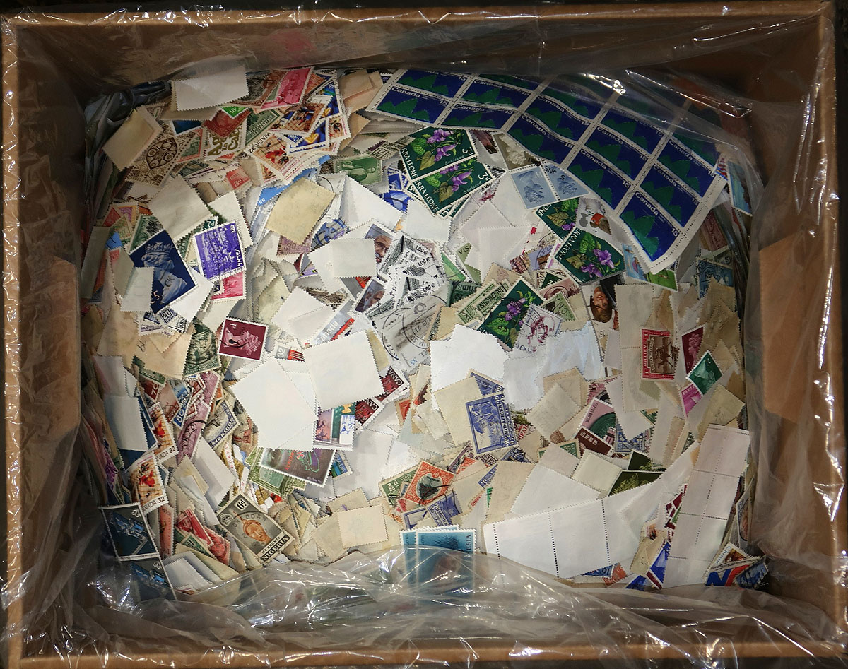 Bankers Box about 2/3 filled with 11lbs off-paper worldwide stamps, the companion to the previous listings, spanning the globe. Yoi can only imagine the amount of hours put into getting these stamps soaked off paper! Estimate =