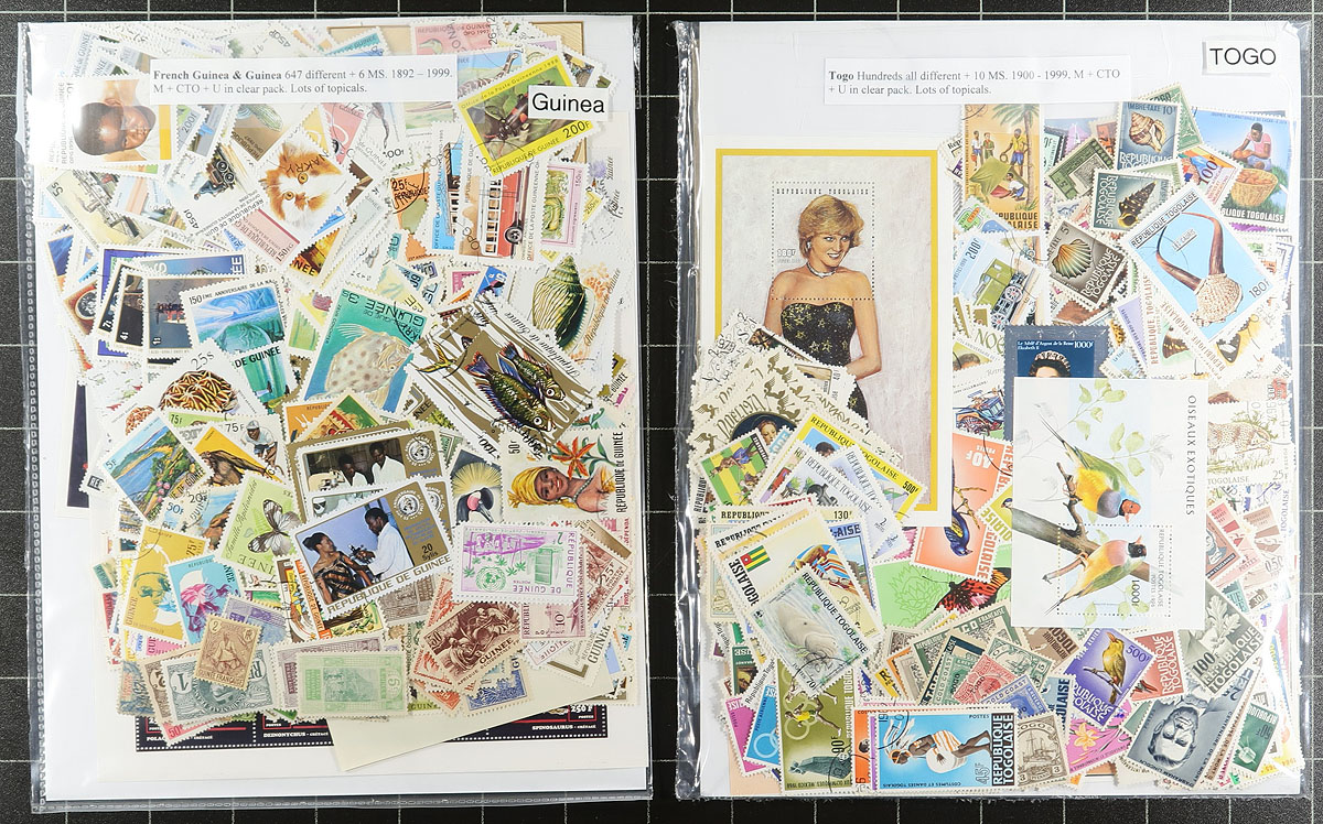A collector’s holding of 11 different packets of off-paper stamps, that will have you reeling from memories of "stamps packets" from days past. A premium packet offering, which includes (in no particular order) 1) Yugoslavia with hundreds of mint and used. 2) Malaysia / Singapore / Hong Kong, mostly used, with 709 stamps (465 different) from QV to QEII. 3) Luxembourg with 548 mostly used 1859-2001. 4) British Empire and Commonwealth, strength in Malta, with 308 different mint and used. 5) Belgium with 371 different mint and used, 1863-2000. 6) French Colonies, with 734 different mint and used, including 2 mint sheets of Chad Football stamps. 7) Guinee (Republic) with 193 different (mostly CTO). 8) Iraq with 385 mint and used, including multiples and duplicates. 9) Chad, 268 different and 14 miniature sheets 1922-1989 mint, used and CTO, lots of topicals. 10) Togo, several hundred 1900-1999 mint, used and CTO. 11) French Guinea and Guinea with 647 different, plus 6 miniature sheets 1892-1999 with mint, used and CTO. A high-quality holding. Estimate =