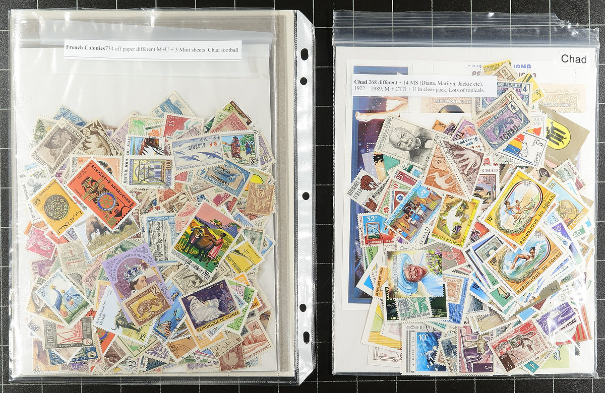 A collector’s holding of 11 different packets of off-paper stamps, that will have you reeling from memories of "stamps packets" from days past. A premium packet offering, which includes (in no particular order) 1) Yugoslavia with hundreds of mint and used. 2) Malaysia / Singapore / Hong Kong, mostly used, with 709 stamps (465 different) from QV to QEII. 3) Luxembourg with 548 mostly used 1859-2001. 4) British Empire and Commonwealth, strength in Malta, with 308 different mint and used. 5) Belgium with 371 different mint and used, 1863-2000. 6) French Colonies, with 734 different mint and used, including 2 mint sheets of Chad Football stamps. 7) Guinee (Republic) with 193 different (mostly CTO). 8) Iraq with 385 mint and used, including multiples and duplicates. 9) Chad, 268 different and 14 miniature sheets 1922-1989 mint, used and CTO, lots of topicals. 10) Togo, several hundred 1900-1999 mint, used and CTO. 11) French Guinea and Guinea with 647 different, plus 6 miniature sheets 1892-1999 with mint, used and CTO. A high-quality holding. Estimate =