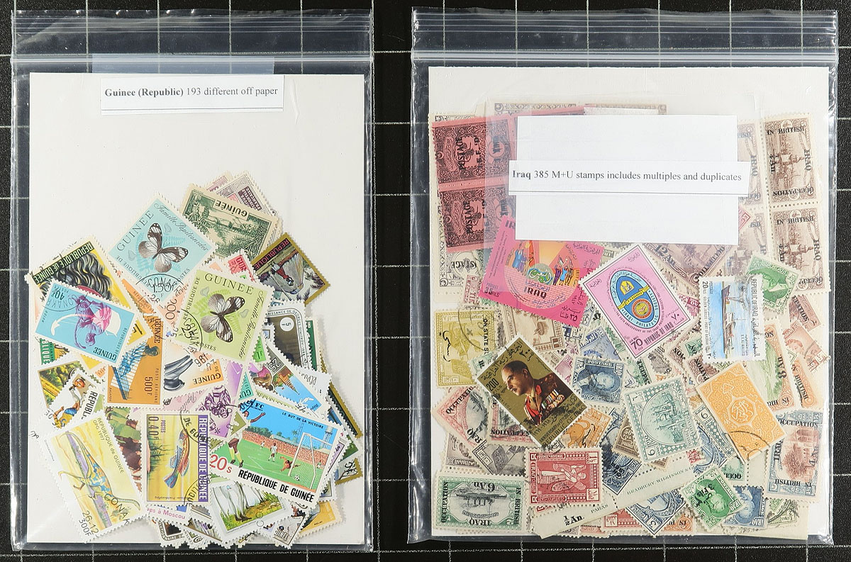 A collector’s holding of 11 different packets of off-paper stamps, that will have you reeling from memories of "stamps packets" from days past. A premium packet offering, which includes (in no particular order) 1) Yugoslavia with hundreds of mint and used. 2) Malaysia / Singapore / Hong Kong, mostly used, with 709 stamps (465 different) from QV to QEII. 3) Luxembourg with 548 mostly used 1859-2001. 4) British Empire and Commonwealth, strength in Malta, with 308 different mint and used. 5) Belgium with 371 different mint and used, 1863-2000. 6) French Colonies, with 734 different mint and used, including 2 mint sheets of Chad Football stamps. 7) Guinee (Republic) with 193 different (mostly CTO). 8) Iraq with 385 mint and used, including multiples and duplicates. 9) Chad, 268 different and 14 miniature sheets 1922-1989 mint, used and CTO, lots of topicals. 10) Togo, several hundred 1900-1999 mint, used and CTO. 11) French Guinea and Guinea with 647 different, plus 6 miniature sheets 1892-1999 with mint, used and CTO. A high-quality holding. Estimate =