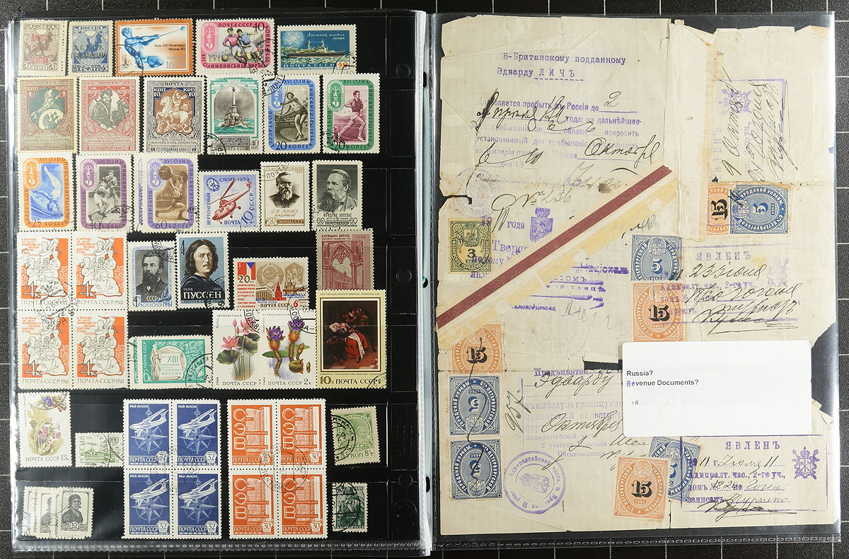 A two-part collector’s holding. Part 1 includes USSR / Russia 1875-1992 mint and used on stockpages with 503 stamps (358 differnet) plus one miniature sheet and a page from a revenue document. Part 2 is a older green stockbook, with 525 different stamps, plus one miniature sheet, mostly used (including CTO) from 1875-1989. An interesting sort for the avid collector. Estimate =