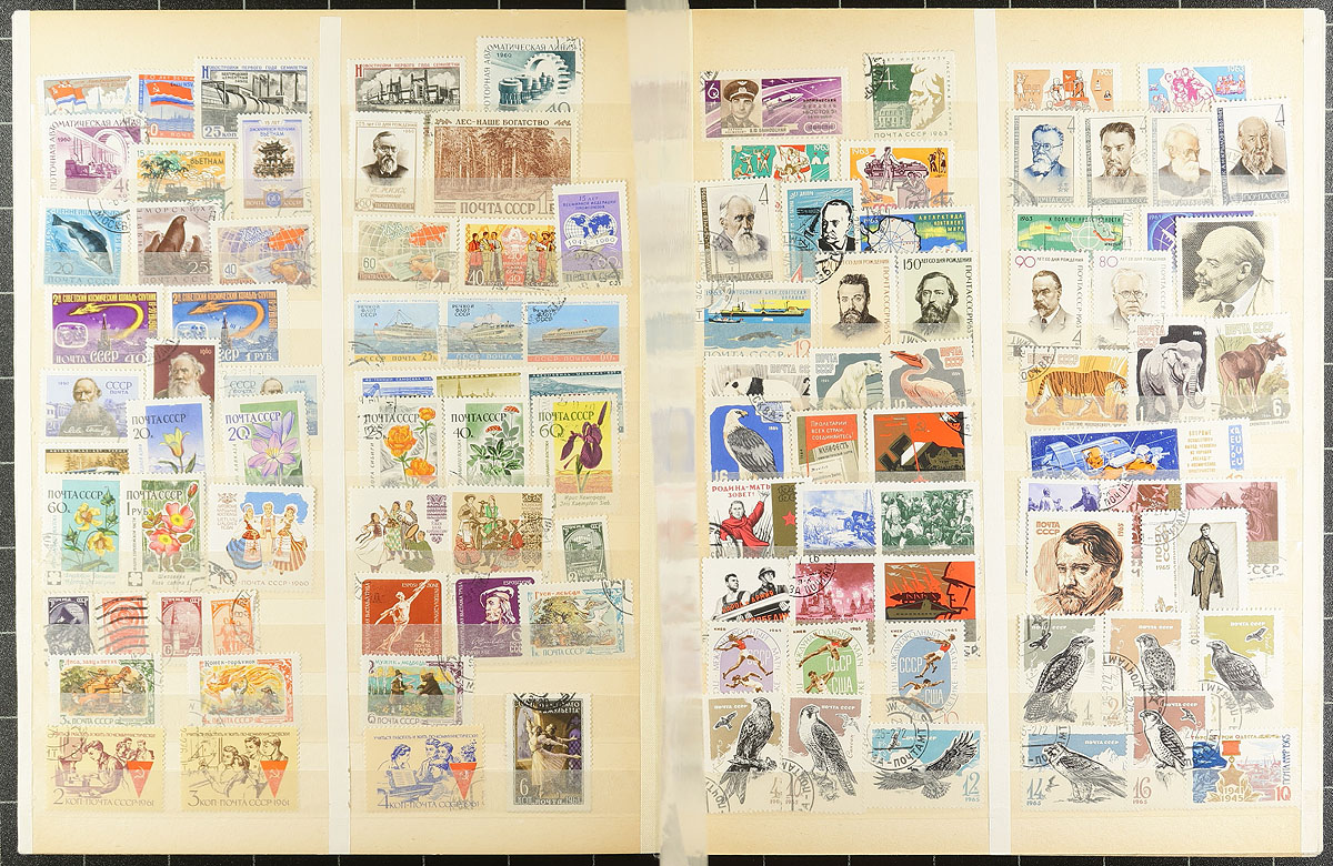 A two-part collector’s holding. Part 1 includes USSR / Russia 1875-1992 mint and used on stockpages with 503 stamps (358 differnet) plus one miniature sheet and a page from a revenue document. Part 2 is a older green stockbook, with 525 different stamps, plus one miniature sheet, mostly used (including CTO) from 1875-1989. An interesting sort for the avid collector. Estimate =