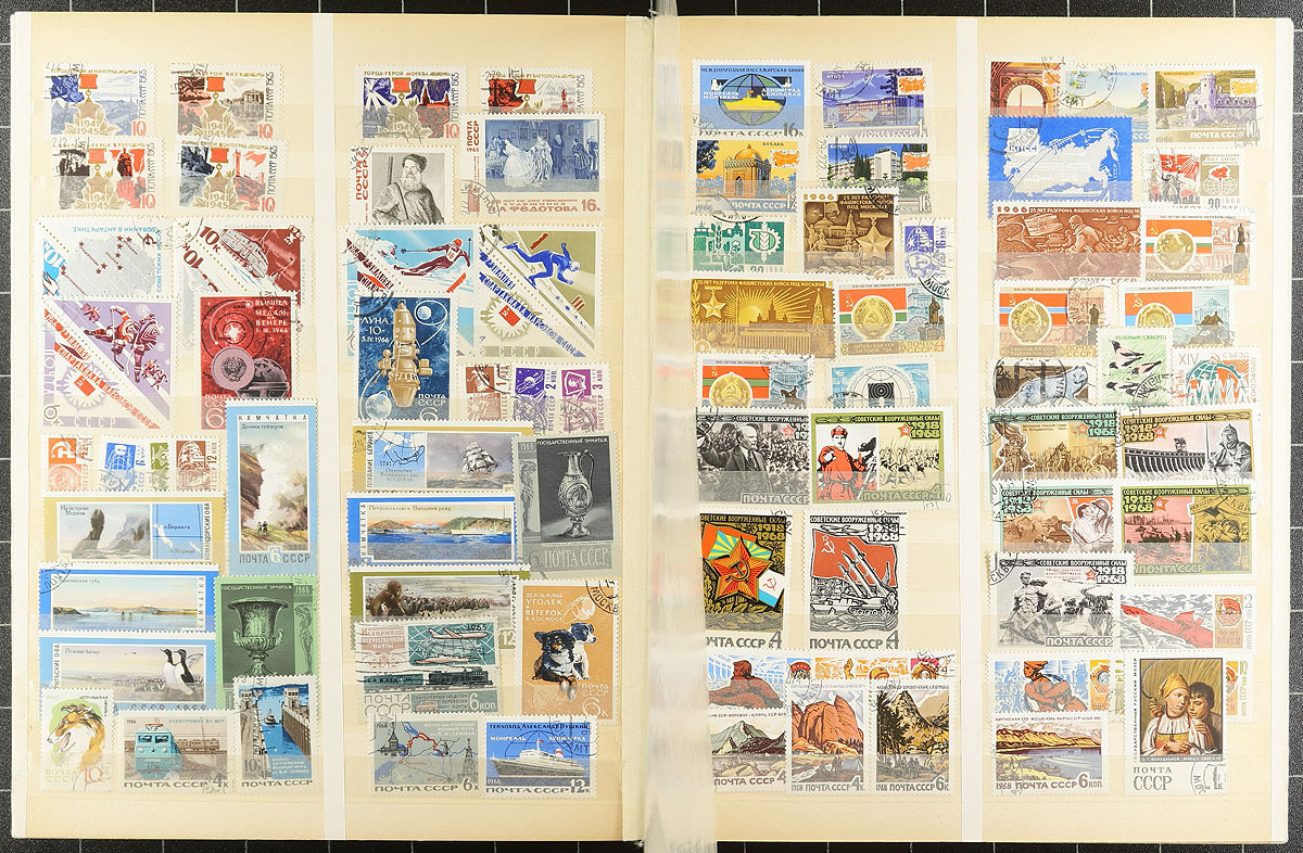 A two-part collector’s holding. Part 1 includes USSR / Russia 1875-1992 mint and used on stockpages with 503 stamps (358 differnet) plus one miniature sheet and a page from a revenue document. Part 2 is a older green stockbook, with 525 different stamps, plus one miniature sheet, mostly used (including CTO) from 1875-1989. An interesting sort for the avid collector. Estimate =