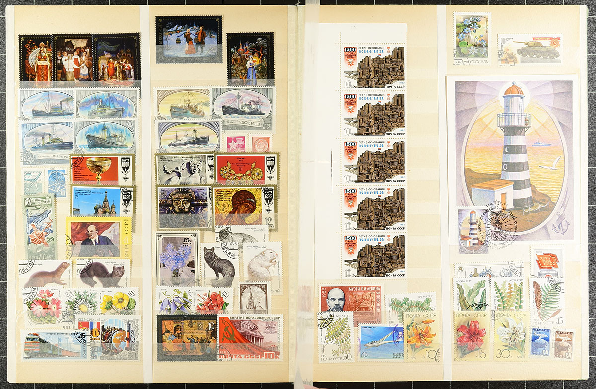 A two-part collector’s holding. Part 1 includes USSR / Russia 1875-1992 mint and used on stockpages with 503 stamps (358 differnet) plus one miniature sheet and a page from a revenue document. Part 2 is a older green stockbook, with 525 different stamps, plus one miniature sheet, mostly used (including CTO) from 1875-1989. An interesting sort for the avid collector. Estimate =