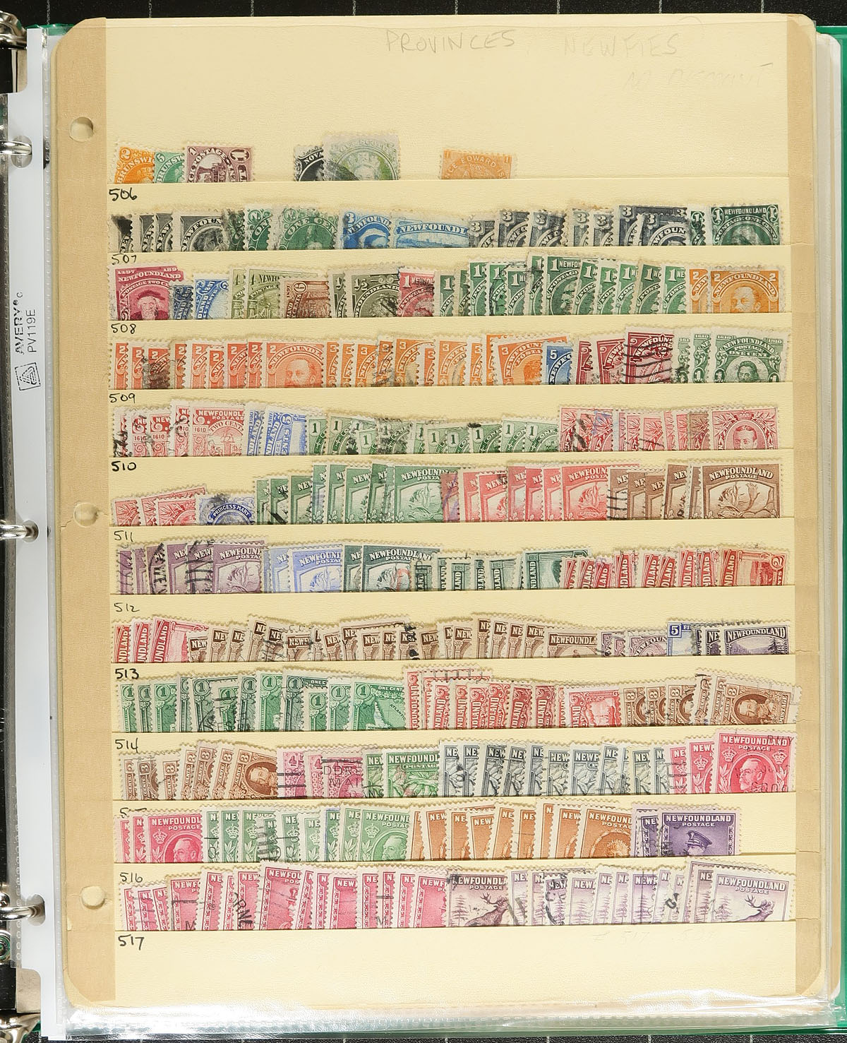 Philatelic Potpourri. A paper ream box, filled with an assortment of material to make any collector smile. Consists of (in no particular order) 1) Stanley Gibbons Windsor album (no pages or stamps). 2) GB Edward VIII official souvenir collection (with GB stamps / offices abroad). 3) World Wildlife Fund souvenir collection with 4 postcards, 3 FDC, elephant stamps and blurb letter from Prince Philip. 4) Cigar boxes x2 with stamps sorted into packets by country. 5) Binder of Latin American mint and used stamps). 6) Travel exhibit and postcards in large white binder. 7) Blue binder with album pages of Balkans, Middle East, SE Asia stamps (includes Marilyn from Mongolia). 8) Canada and Newfoundland collection / stock, 1868-2001 with Newfoundland 86 different (450 stamps total), Canada 1200 different (2740 stamps total) including recent used, all laid out on stockpages (noted a forgery NS provincial), expect some faults in the earlier material. Estimate =