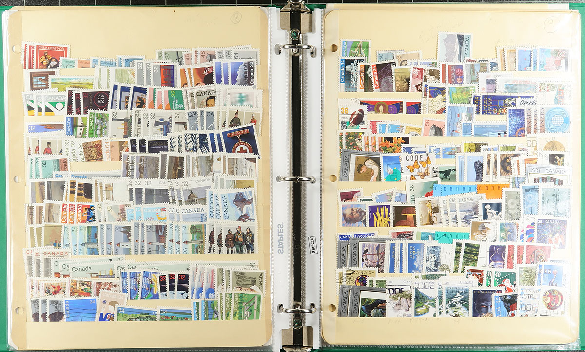 Philatelic Potpourri. A paper ream box, filled with an assortment of material to make any collector smile. Consists of (in no particular order) 1) Stanley Gibbons Windsor album (no pages or stamps). 2) GB Edward VIII official souvenir collection (with GB stamps / offices abroad). 3) World Wildlife Fund souvenir collection with 4 postcards, 3 FDC, elephant stamps and blurb letter from Prince Philip. 4) Cigar boxes x2 with stamps sorted into packets by country. 5) Binder of Latin American mint and used stamps). 6) Travel exhibit and postcards in large white binder. 7) Blue binder with album pages of Balkans, Middle East, SE Asia stamps (includes Marilyn from Mongolia). 8) Canada and Newfoundland collection / stock, 1868-2001 with Newfoundland 86 different (450 stamps total), Canada 1200 different (2740 stamps total) including recent used, all laid out on stockpages (noted a forgery NS provincial), expect some faults in the earlier material. Estimate =