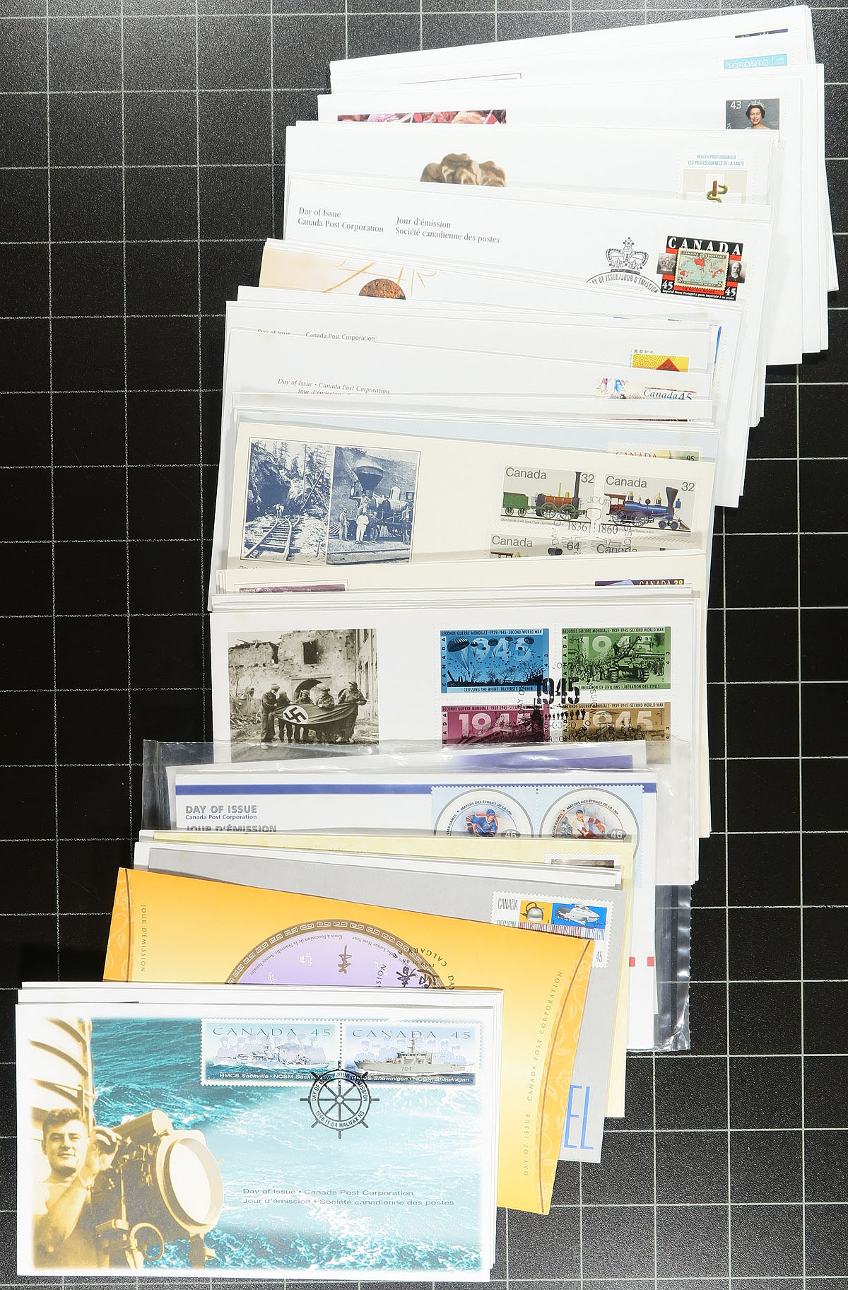 First Day Covers. Accumulation of roughly 700 Canada first day covers, 1970's-1990's, noting singles, sets, plate block, and high denomination frankings, including a few covers that catalogue $10 and up. A nice clean lot for collectors and dealers alike. Estimate =