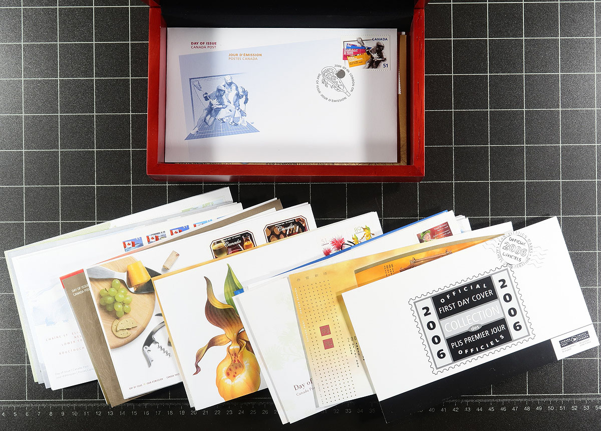 First Day Covers. Group of roughly 300 Canada modern first day covers, 1995-2009, in a few formats including a 2006 official first day cover collection complete in a Canada Post wooden box, 1999 and 2000 year collection in still sealed packs from Canada Post, 2 cover albums and roughly 75 loose covers. We note singles, sets, plate block, souvenir sheet, and high denomination frankings. A nice lot for collectors and dealers alike. Estimate =